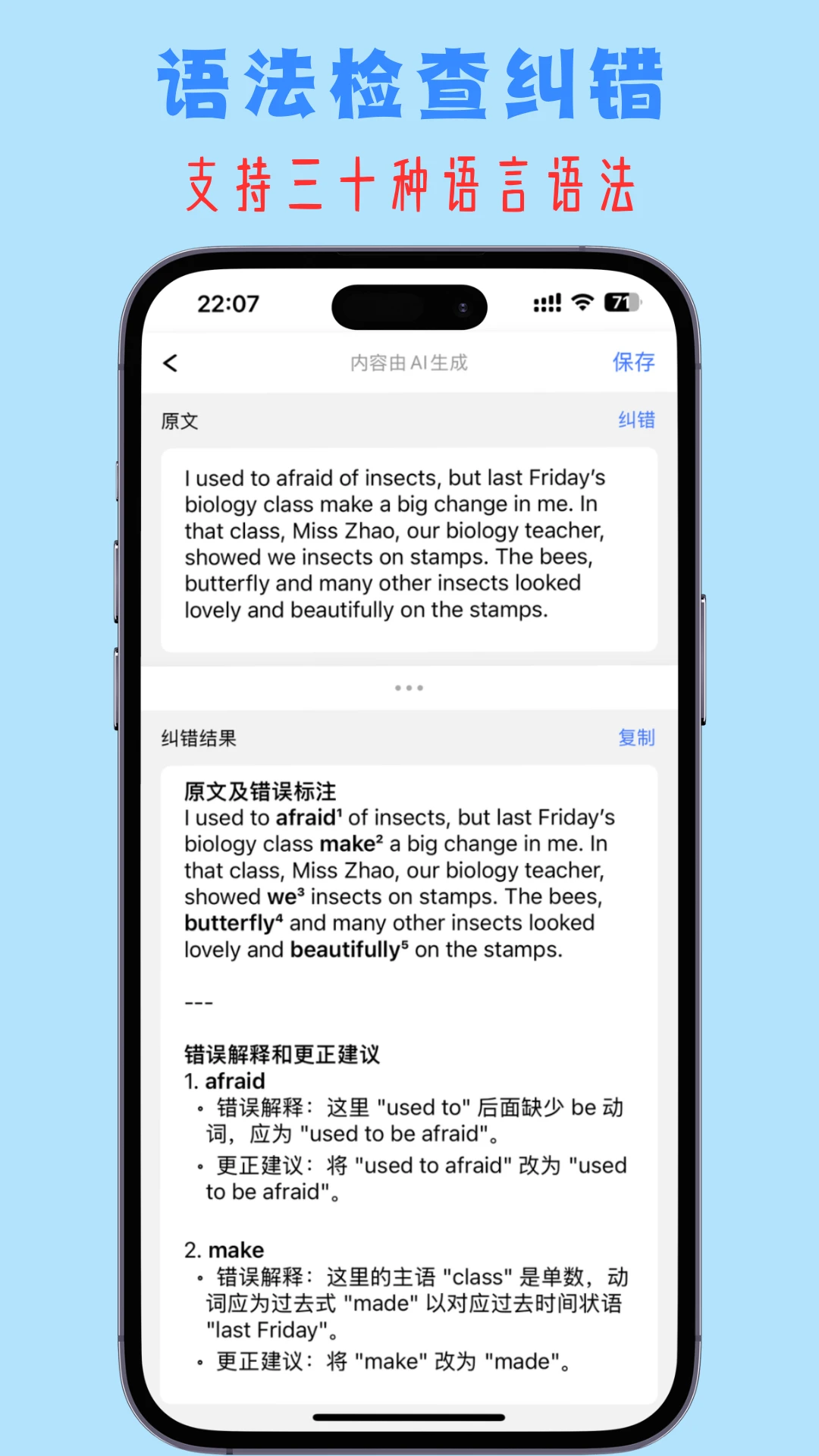 语法纠错:一键检测语法错误,支持英语、日语、韩语、俄语等30种语言,提升写作准确性。