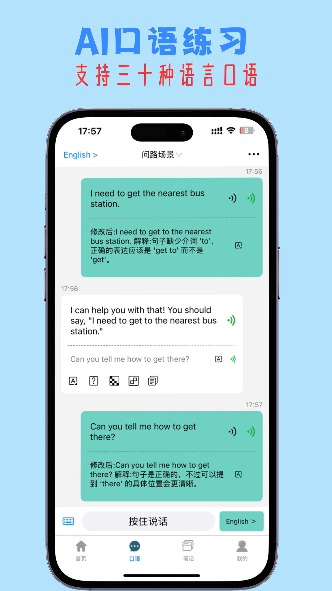 **AI口语**:支持十几种语言,实时纠错和反馈,并给出提示和引导,轻松练习口语
