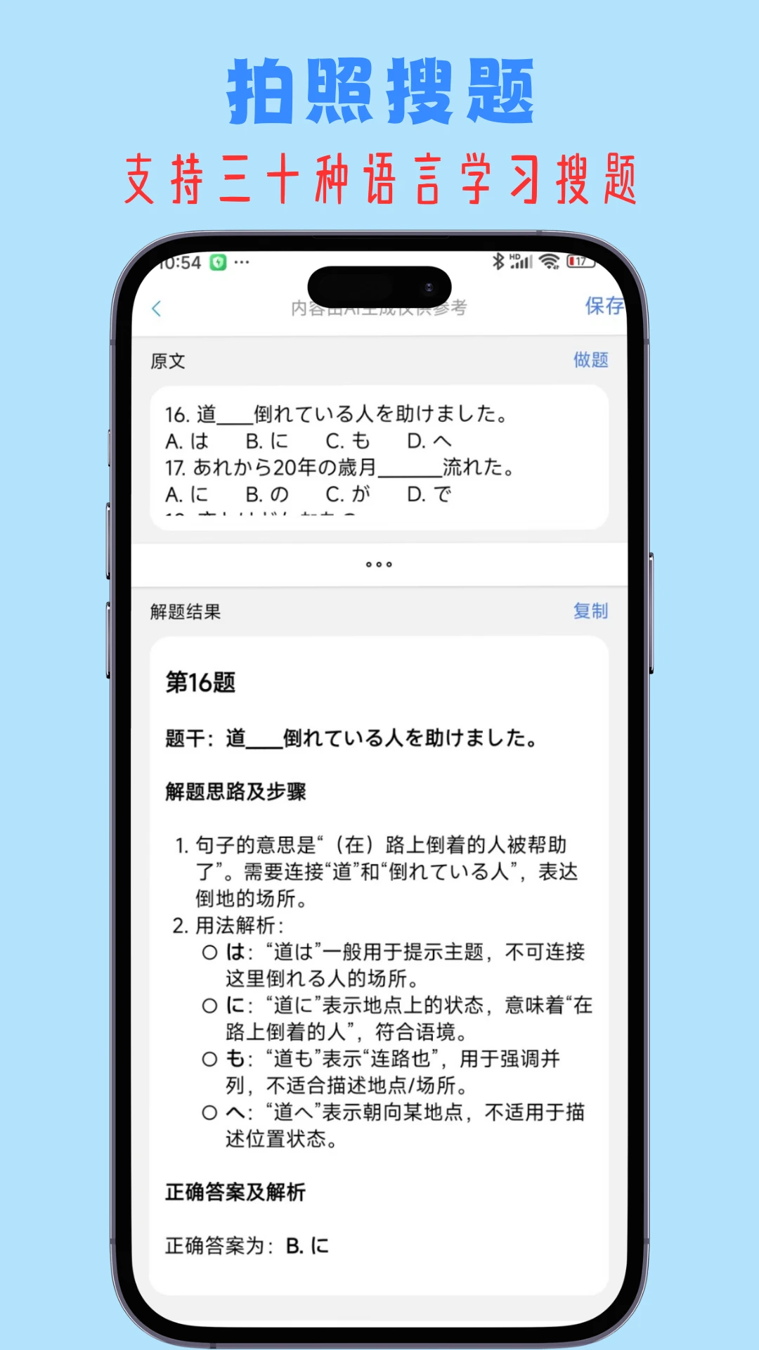 **拍照搜题**:拍照或上传习题图片,一键解题并给出解题步骤,支持英日韩俄30种语言习题搜题