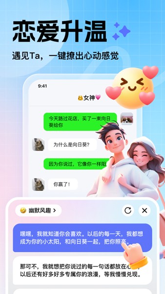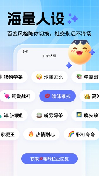 场景化表达功能覆盖各类社交需求。在【恋爱助攻】模式下,您可以自由切换多种聊天人设,系统会生成令人心动的话术,让感情交流更加甜蜜。职场人士则可以使用【职场生存】模式,根据不同的职场情境选择最得体的回复方式,轻松塑造专业形象。每逢佳节,【节日祝福】功能提供覆盖职场、亲友等场景的定制祝福模板,3秒就能生成走心贺词。日常闲聊时,【日常生活】功能会智能推荐当下热门梗和趣味表达,让普通对话也变得妙趣横生。