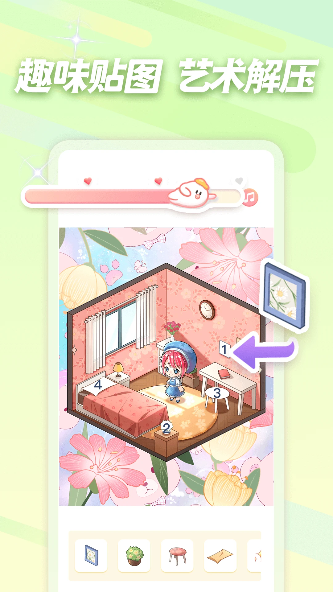 全新升级玩法:趣贴图创新贴纸拼图模式,将艺术创作与解压放松完美结合,带来全新体验。治愈系画风:Q萌二次元风格设计,色彩明亮柔和,操作简单流畅,有效缓解压力。
