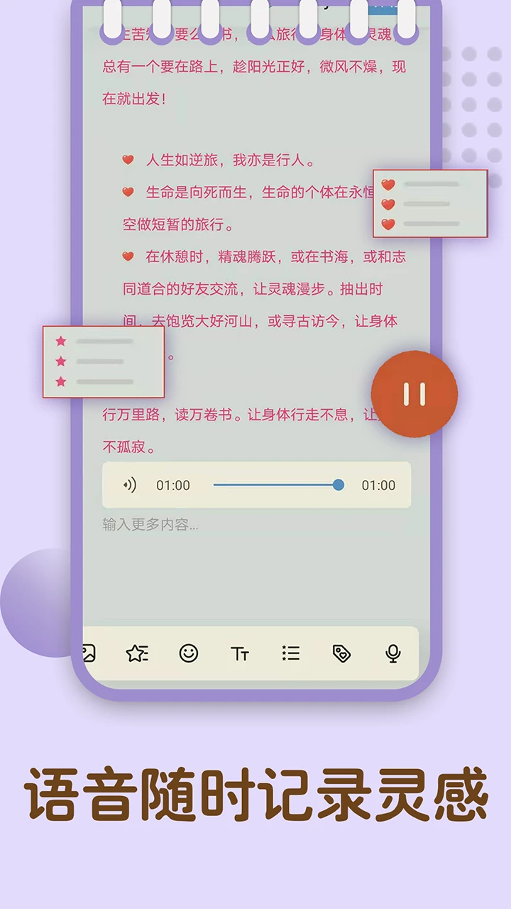 提供贴纸和表情符号库,用户可以通过可爱元素表达心情,增强日记趣味性。