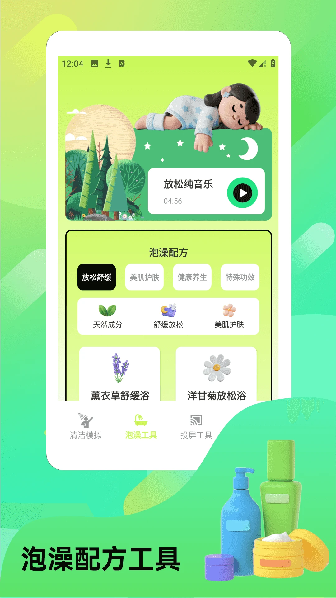 记录当天的清洁程度、清洁工具、泡澡工具、搓澡技巧,泡澡配方、投屏工具、纯音乐播放,让你一边泡澡,一边悠闲的看视频听音乐,享受放松时刻。