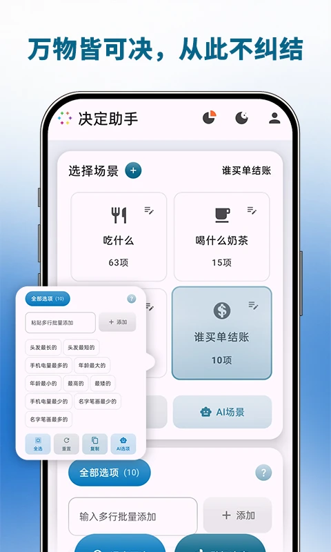 自定义场景:你的难题独一无二?一键添加专属决策场景,如“该买哪款手机?”“是否要接受这份工作?”。