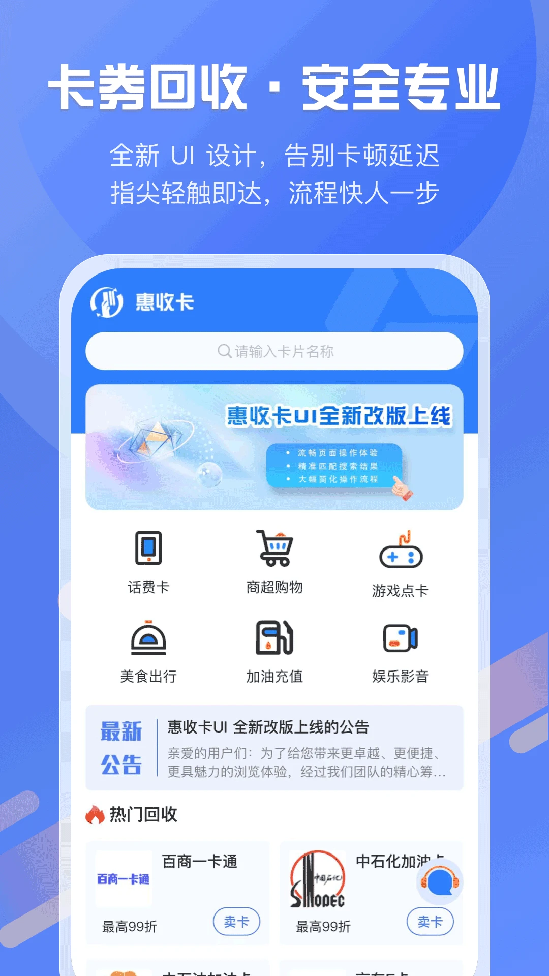 惠收卡是一款专注于卡券回收领域的正规应用。业务范围极为广泛,囊括300多种卡券回收业务,像线上购物常用的京东E卡礼品卡;日常采购的沃尔玛超市购物卡、永辉超市卡、天猫超市卡、盒马先生礼品卡;出行必备的中石化加油卡;通信离不开的联通、移动、电信话费卡;满足味蕾享受的肯德基代金券、必胜客礼品卡;日常外卖福利饿了么月卡;社交休闲的星巴克星礼卡;以及用于娱乐消遣的爱奇艺会员卡、腾讯视频会员卡、喜马拉雅会员卡等,统统都在回收清单上。其功能主要体现在以下几个方面:•广泛的卡券回收种类:几乎涵盖了所有常见类型的卡券,从话费卡、加油卡到商超购物卡、电商礼品卡,再到游戏点卡、视频会员卡以及美食代金券等,能满足不同用户手中各类闲置卡券的回收需求。