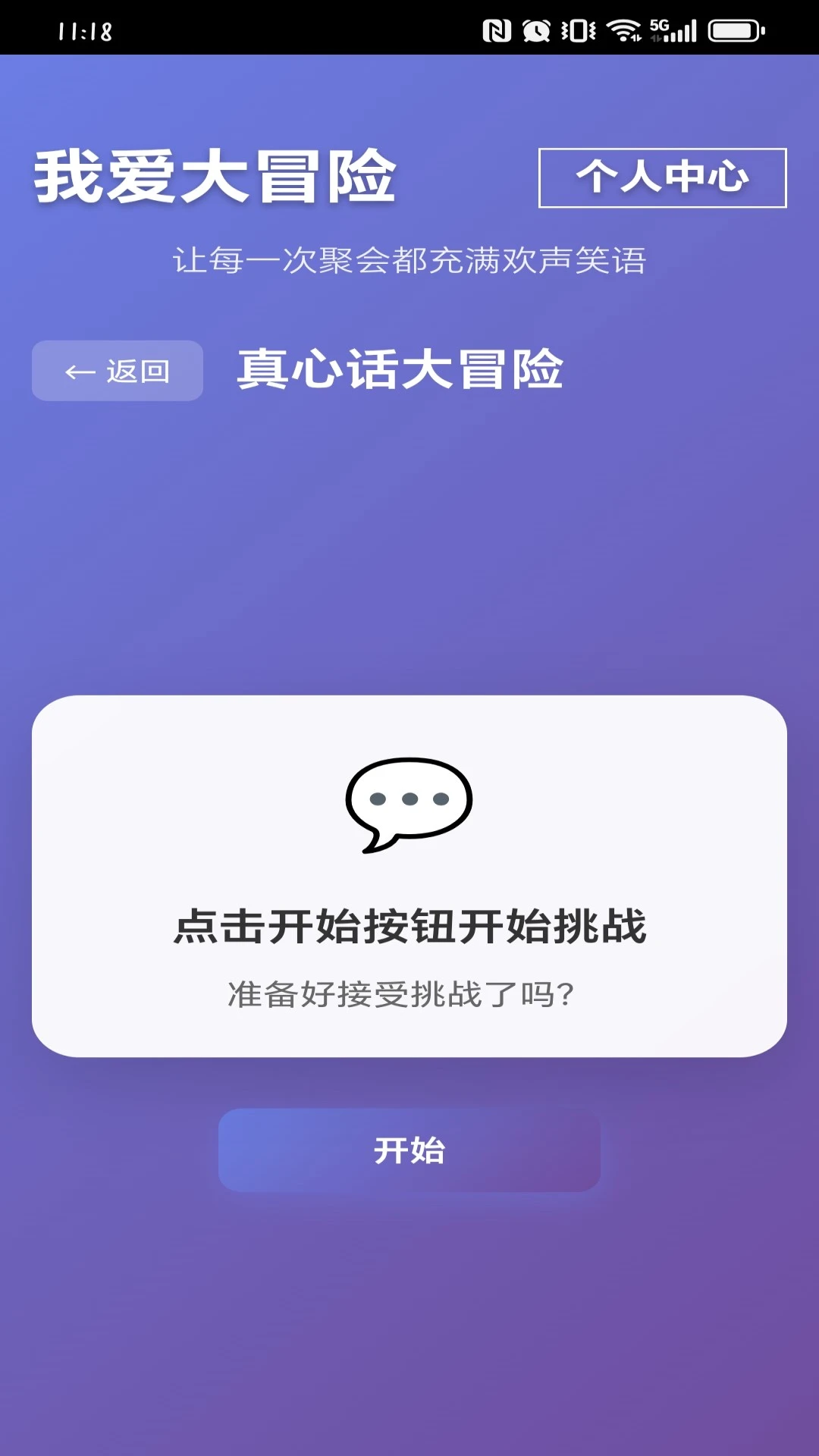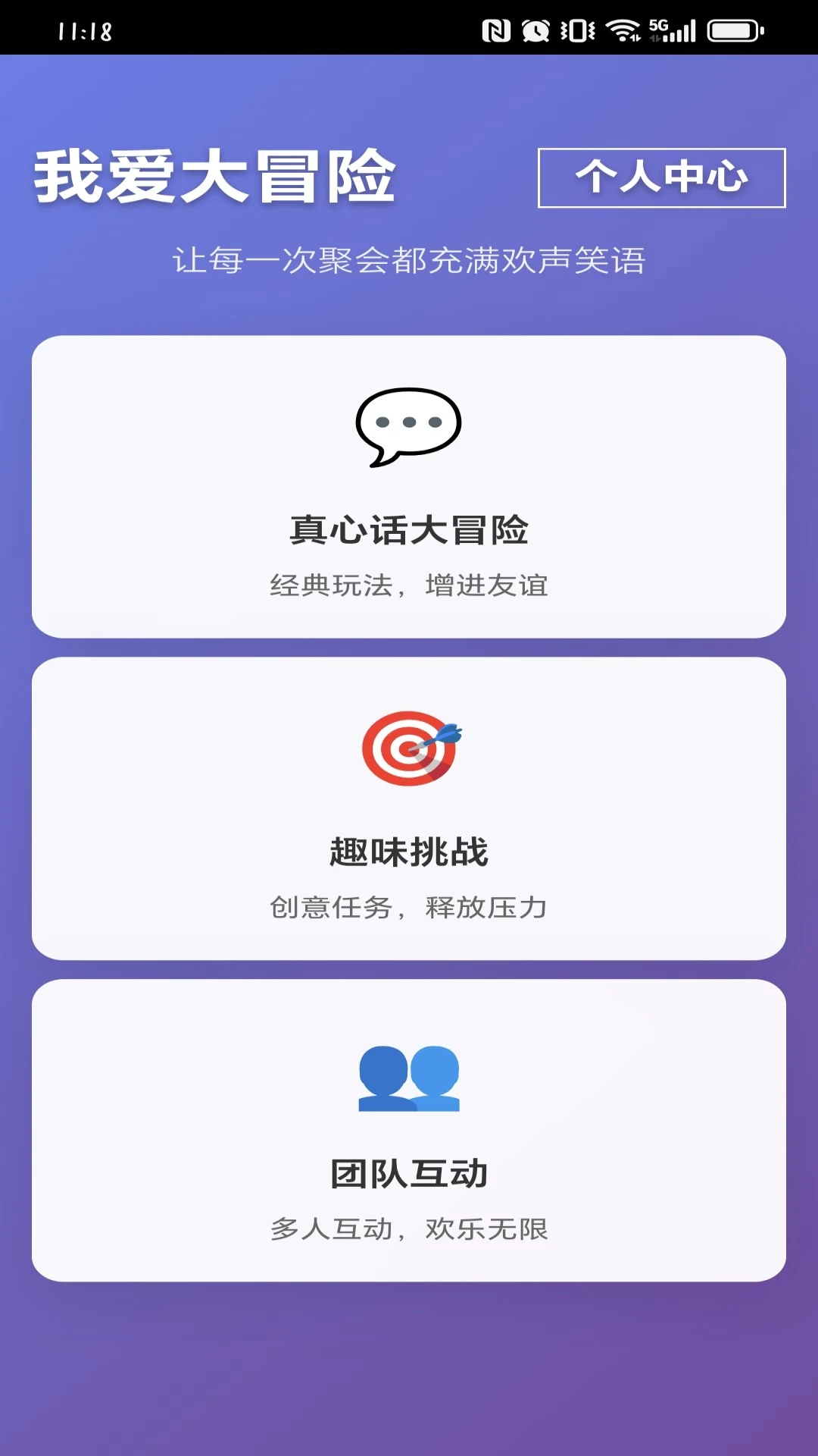 我爱大冒险一款聚会必备互动APP!提供海量真心话大冒险题库和趣味挑战,支持多人实时互动,轻松活跃聚会气氛,让朋友聚会、公司团建更有趣。