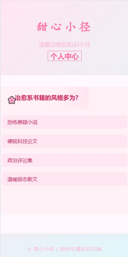 《甜心小径》是一款专为现代人设计的治愈系互动应用,通过趣味答题的方式为用户提供心灵疗愈的体验。无论是压力大的上班族,还是需要放松的学生党,都能在这款应用中找到属于自己的治愈方法。简洁清新的界面设计,搭配轻松的操作流程,让每一次答题都成为一次愉悦的心灵之旅。《甜心小径》不仅是一款应用,更是一个温暖的陪伴者,帮助用户在忙碌的生活中找到片刻的宁静与快乐。