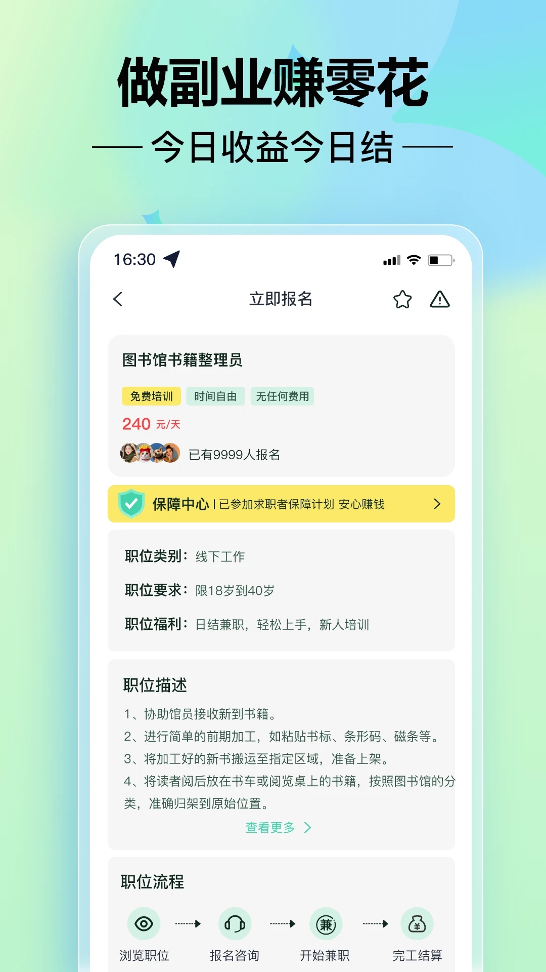 每日实时推荐薪资日结岗位,保证薪资发放及时。覆盖上千种兼职岗位,热门岗位类型多,选择多;包括:作业批改、麦当劳兼职、收银员餐厅服务员、