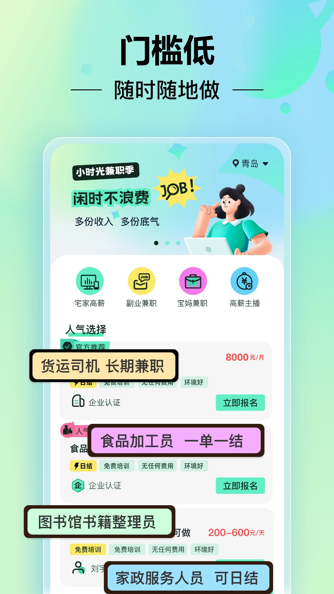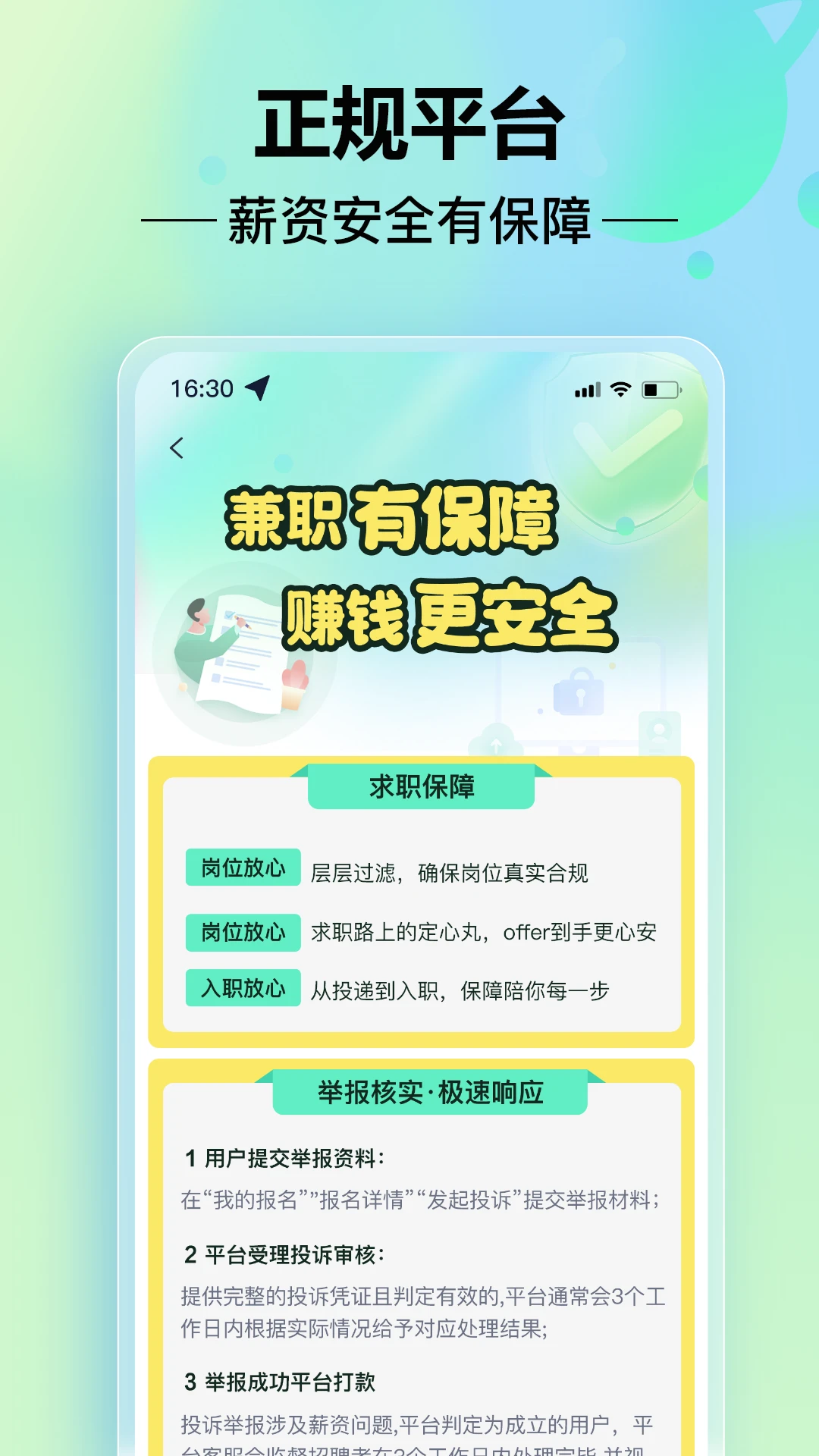 帮助宝妈、学生、蓝领、没经验的普通人快速寻找合适自己的副业兼职;不卡学历,不卡经验,让您随时随地也能赚钱的神器,兼职、副业、求职、找工作,千万兼职用户的选择!注意:本平台仅支持为18岁以上的用户提供兼职服务。