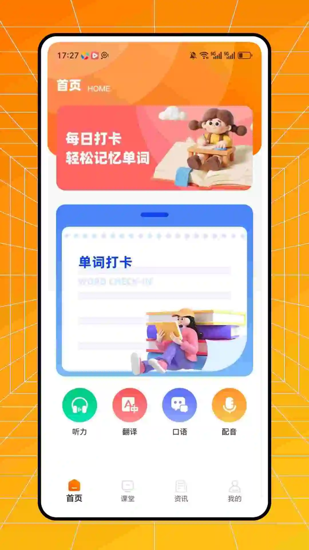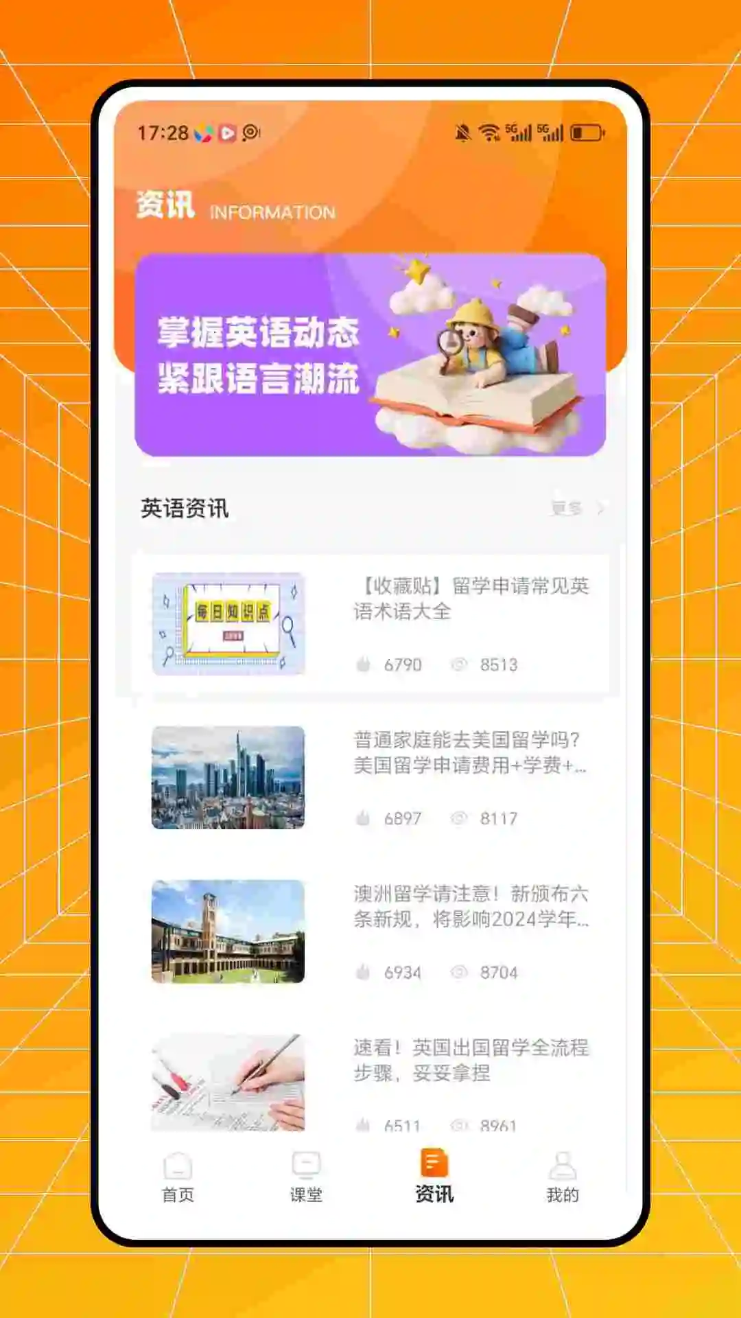 首页「单词打卡」模块支持每日记忆,搭配听力、翻译、口语、配音等功能入口,学习场景一键切换;「课堂」专区提供英语阅读、新概念英语、经典谚语等系统内容,还有单词技巧、写作翻译等干货,精准补全知识短板;「资讯」板块汇总留学英语术语、各国留学攻略,同步语言实用动态;