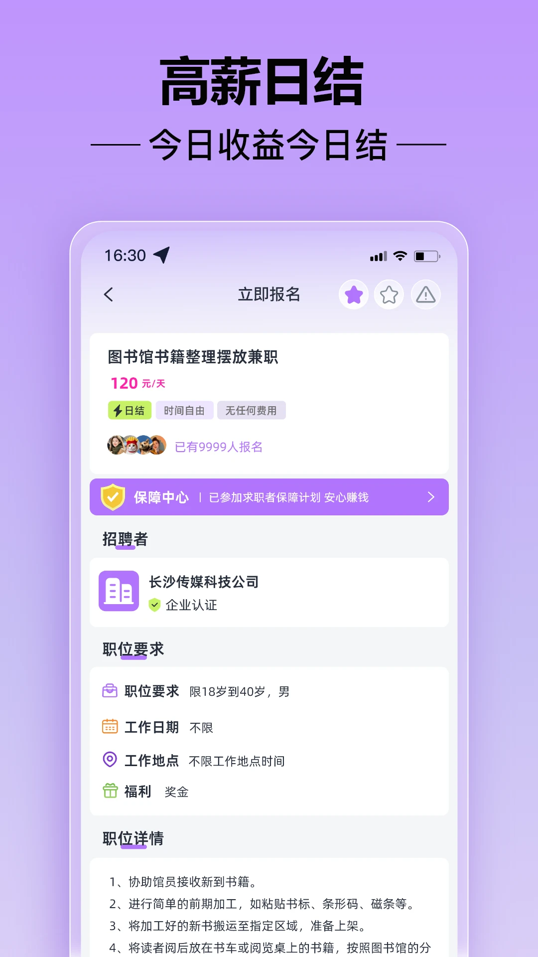 薪资日结服务:兼职完成后薪资快速结算,无需等待,保障用户资金安全。