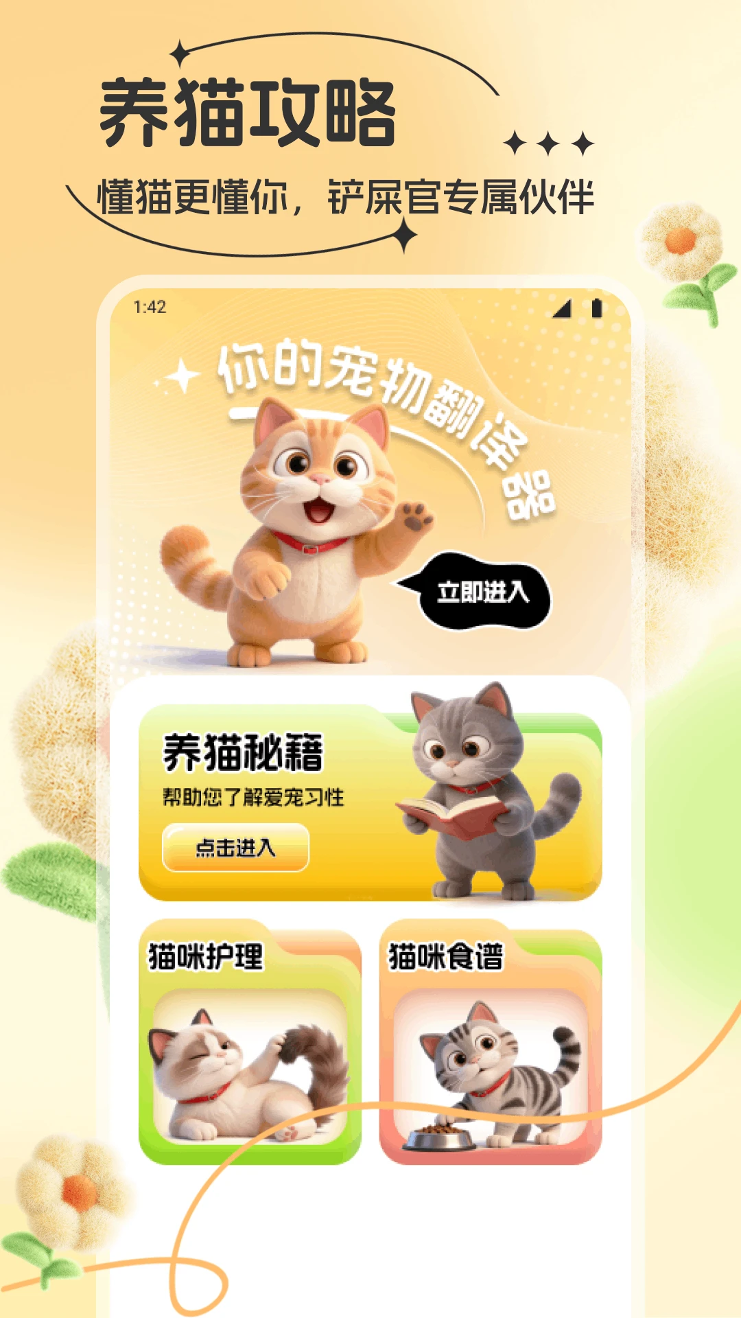 一款专为爱猫人士打造的治愈系全能助手,集猫咪知识科普、健康管理、宠物壁纸、集趣味互动、科学养育与情感连接于一体。无论您是新手铲屎官还是资深猫奴,这里都能满足您与猫咪共度的每一个温馨日常。让每一位铲屎官都能轻松读懂毛孩子的喵星语,解锁更温暖的养宠生活!温馨提示:猫语翻译功能仅供娱乐。
