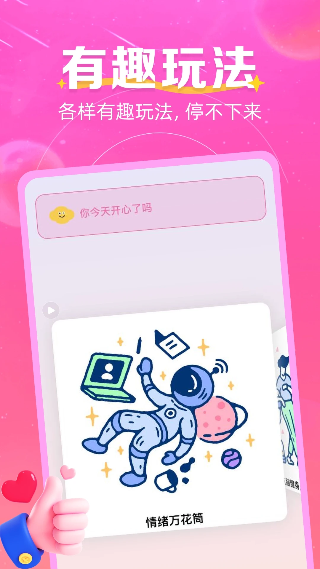 你的全能生活玩伴!功能亮点:心情日历|不止记录心情而已测试星球|给大脑做一场趣味SPA决定星球|选择困难症的终极救星能量星球|随身快乐充电宝/情话库里的浪漫制造机/成为哲学家的第一课/古诗词大赏摸鱼星球|你的电子手账本404星球|你的专属放松程序。