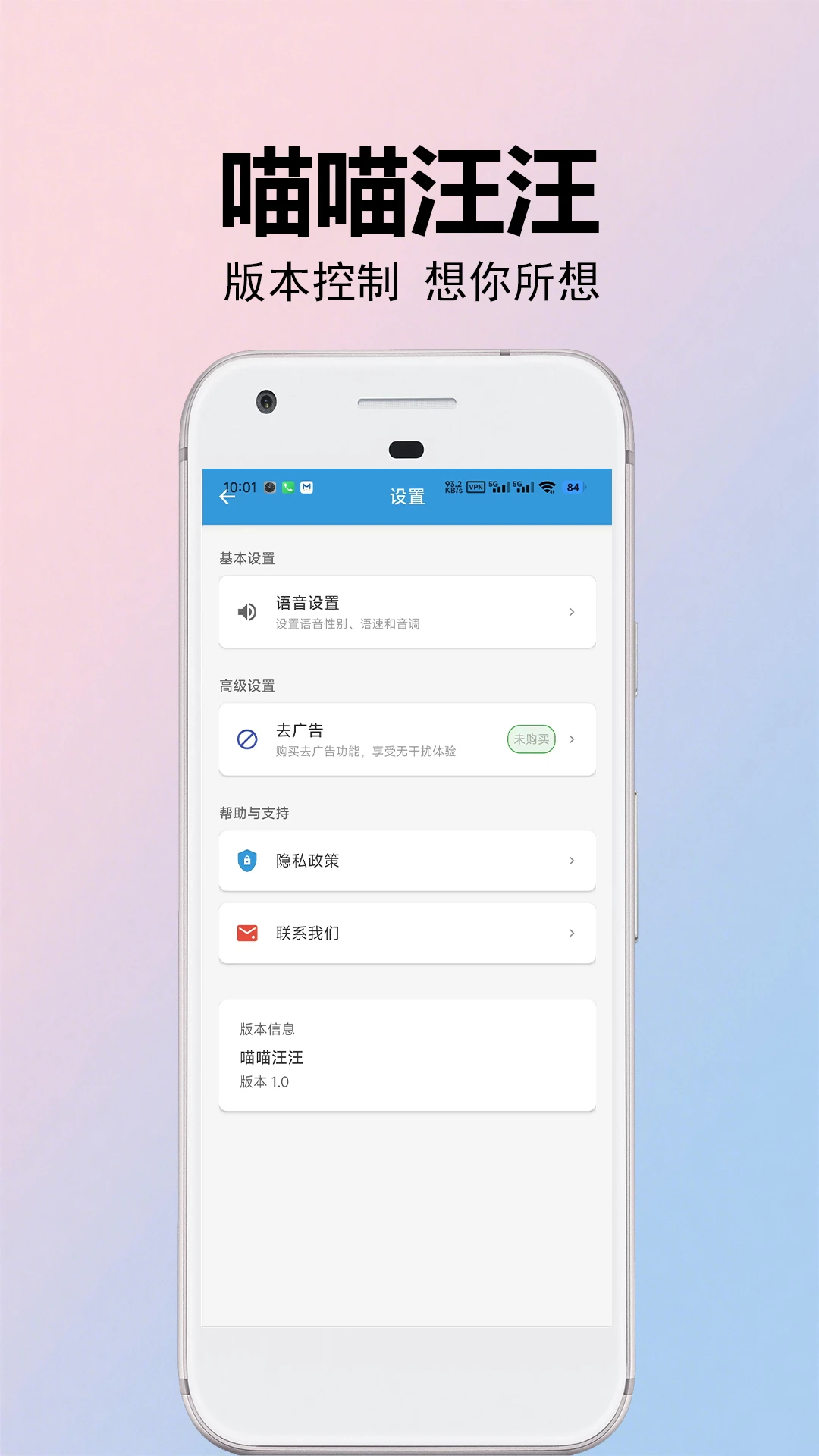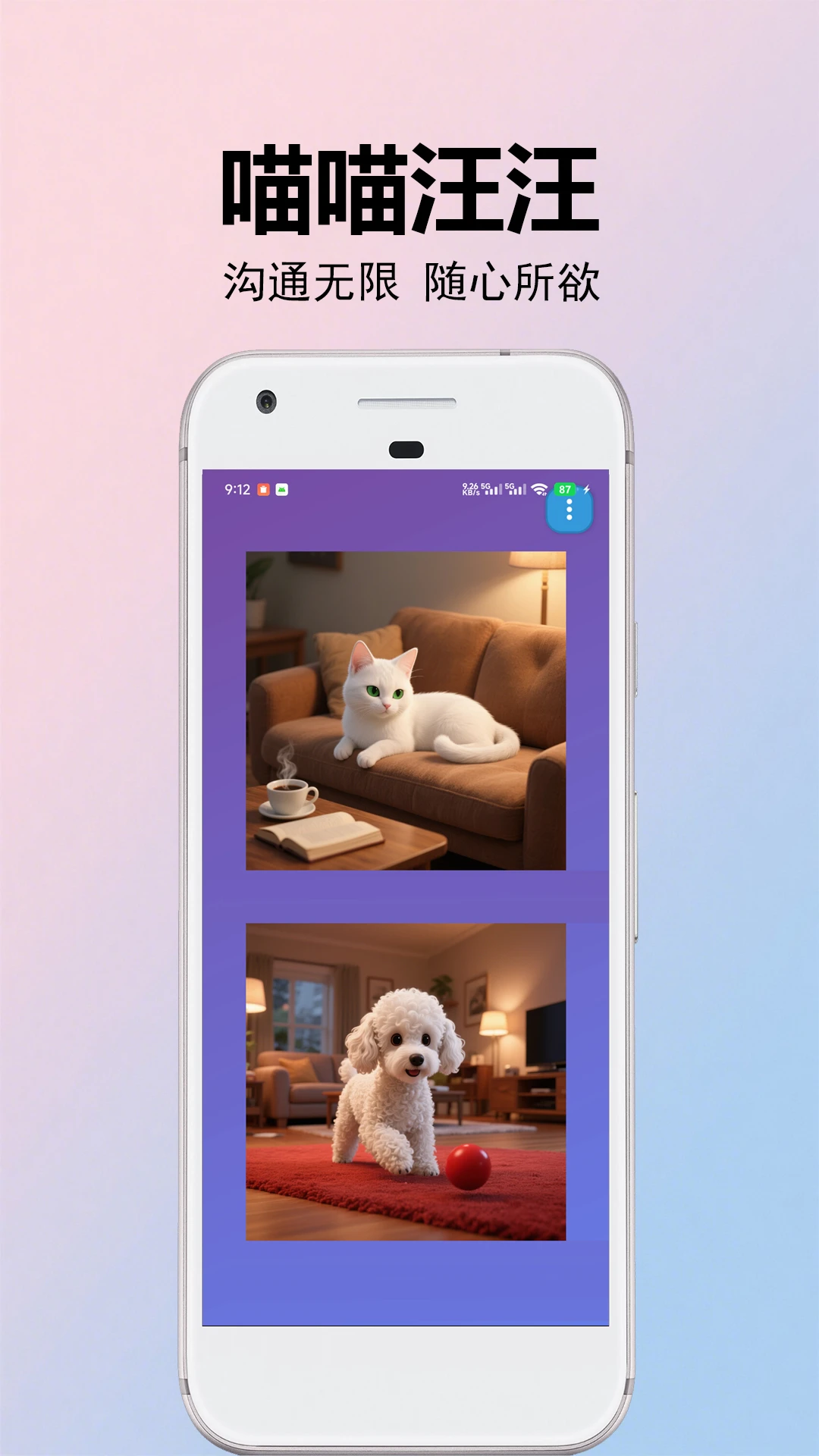 《喵喵汪汪》是一款智能宠物声音翻译助手。采用先进算法识别猫狗叫声,实时翻译宠物情感,让您读懂爱宠心声。支持人宠互译、录音回放及语音朗读功能,操作简单便捷。无论是逗宠娱乐还是情感交流,都能为您带来全新的互动体验。