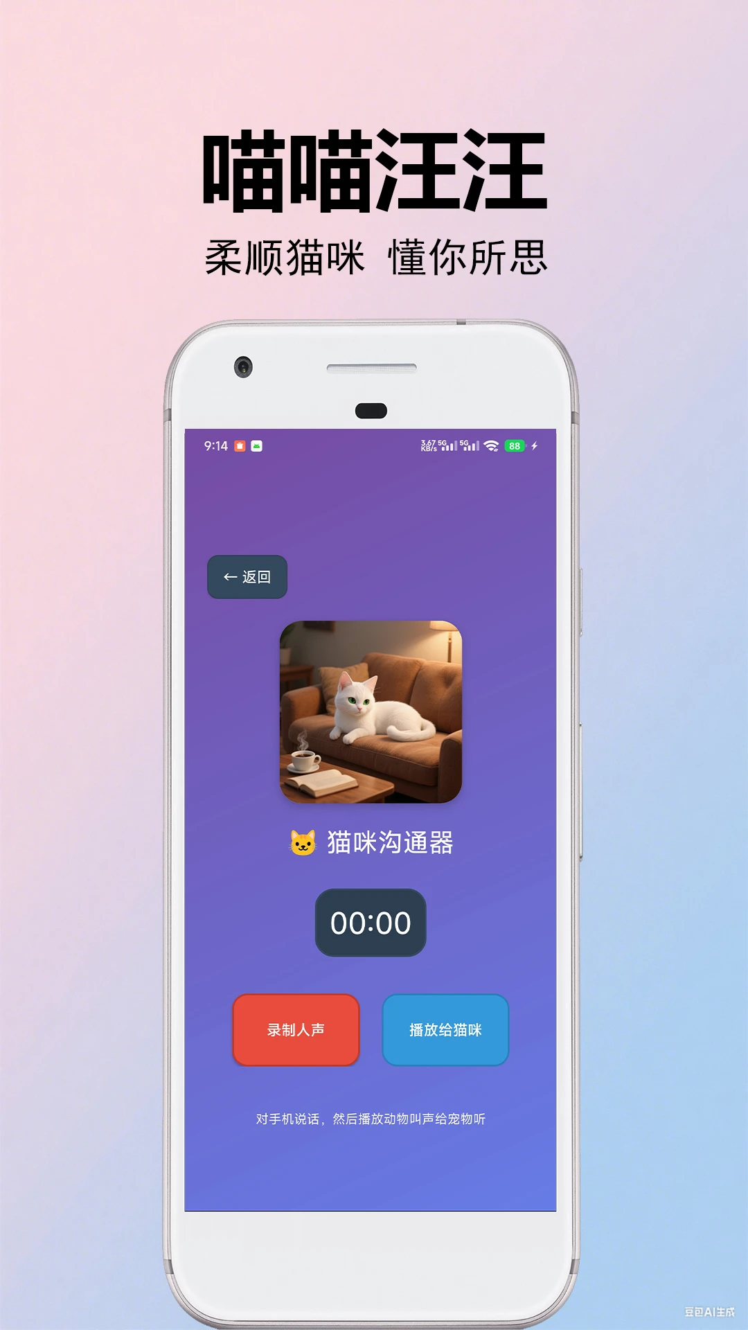 《喵喵汪汪》是一款专为爱宠人士设计的智能声音翻译助手,通过先进的AI算法精准识别猫狗叫声,实时翻译宠物的情绪和需求,帮助主人与爱宠建立更深层次的情感连接。无论是日常互动、健康监测还是行为训练,这款应用都能提供直观的反馈和个性化的建议。简洁的界面设计和一键操作模式,让科技小白也能轻松上手,成为宠物家庭不可或缺的"沟通桥梁"。