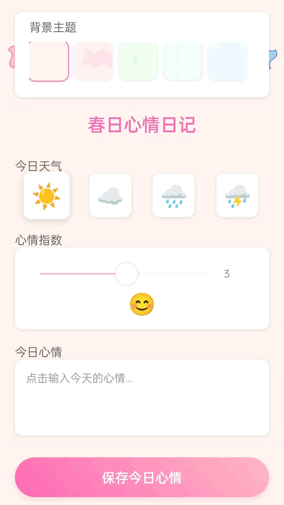 【春日心情日记】:您可以选择背景主题,记录今日天气(如晴天、多云、下雨、雷雨等),通过心情指数滑块(如3分)和表情符号来表达心情,还能点击输入今天的心情文字。
