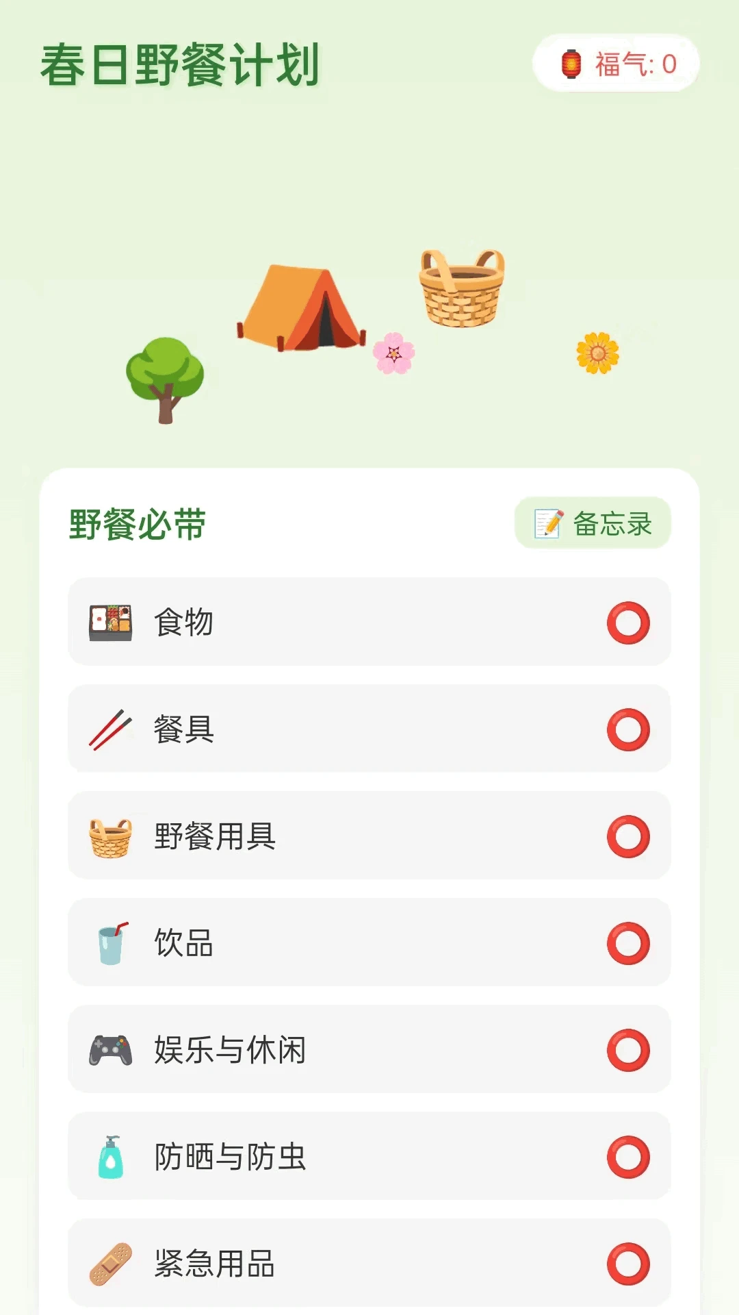 【春日野餐计划】:列出了野餐必带物品,包括食物、餐具、野餐用具、饮品、娱乐与休闲用品、防晒与防虫用品、紧急用品等,每项都有对应的图标,并且可以点击旁边的“备忘录”进行详细记录。