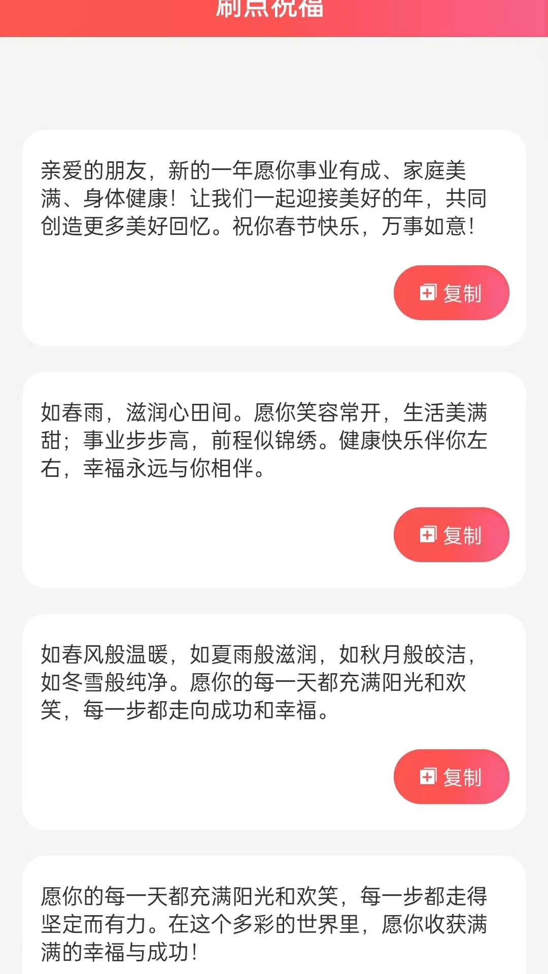 【刷点祝福】:汇聚了众多温馨美好的祝福语,如“亲爱的朋友,新的一年愿你事业有成、家庭美满、身体健康!让我们一起迎接美好的年,共同创造更多美好回忆。