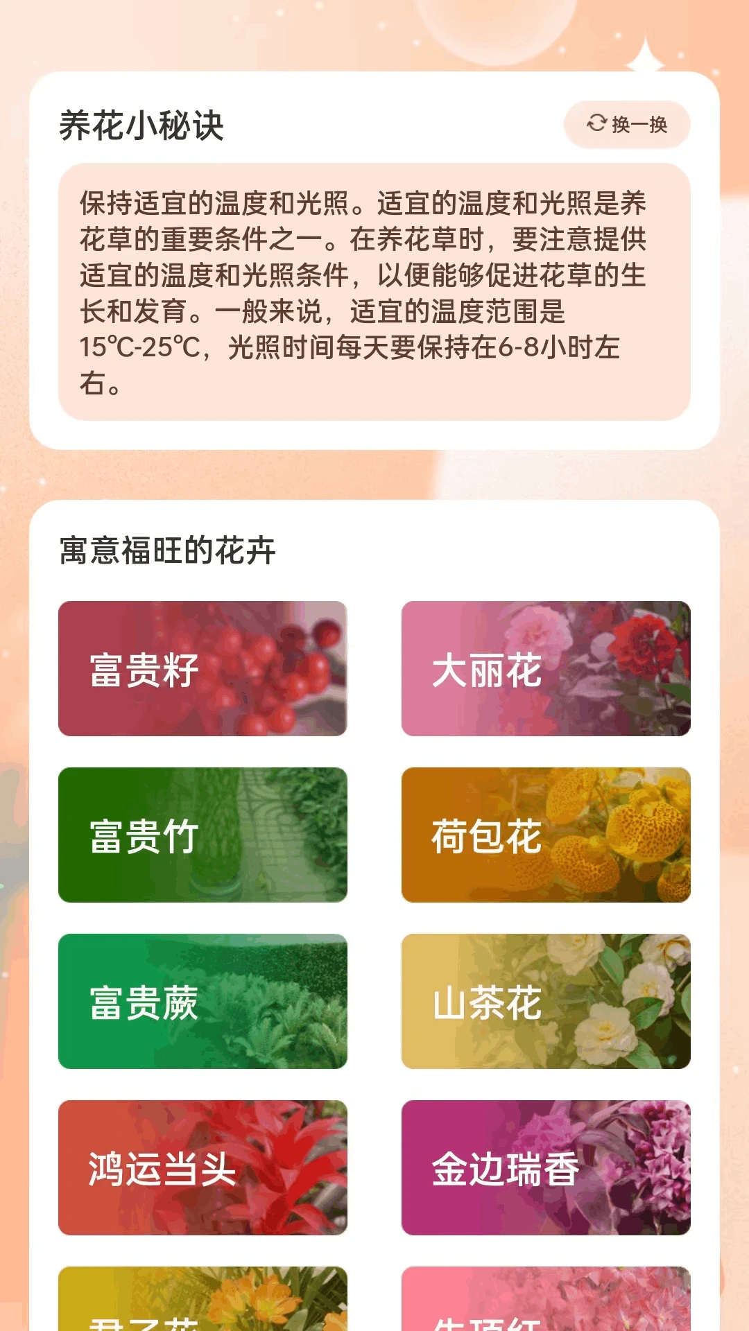 养花知识库:提供超过100种常见花卉的养护指南,涵盖浇水频率、光照需求、土壤配比等专业内容,新手也能快速入门。吉祥花卉图鉴:精选30+种象征福运的花卉,每种配备4K高清图片与3D旋转展示,长按花语标签可保存为手机壁纸。