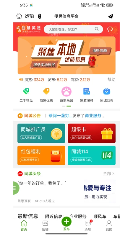 便民信息实时交互平台,支持用户自由发布租房、二手交易等生活信息商家动态聚合窗口,整合餐饮、零售等行业的限时折扣和会员福利