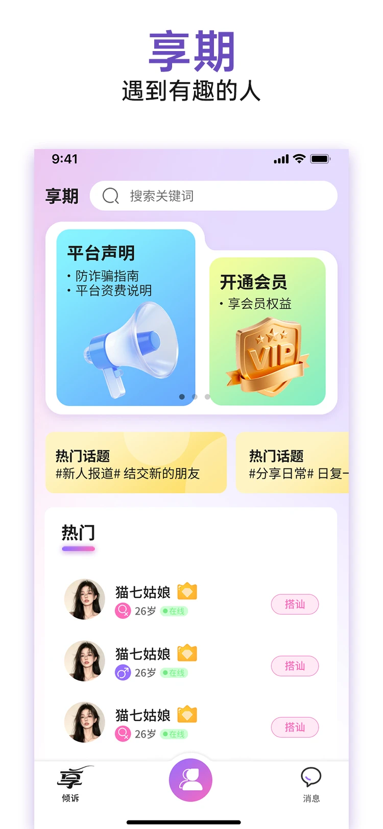 享期--专为中年人打造的轻松社交平台,在这里您可以视频畅聊、语音匹配、分享生活,结识志趣相投的朋友。无论是寻找聊天伙伴、兴趣同好,享期能让社交更自然,更有温度,享受当下时光,