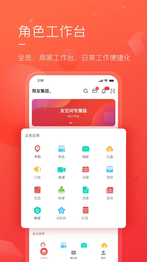 友空间-私有入口版是用友旗下的一款免费的移动办公软件。私有入口版是面向大中型企业和组织的"融合、开放、连接"的协同平台,帮助企业实现高效办公协同工作。实现企业与企业、企业与人的协同、交易等社会化商业活动。