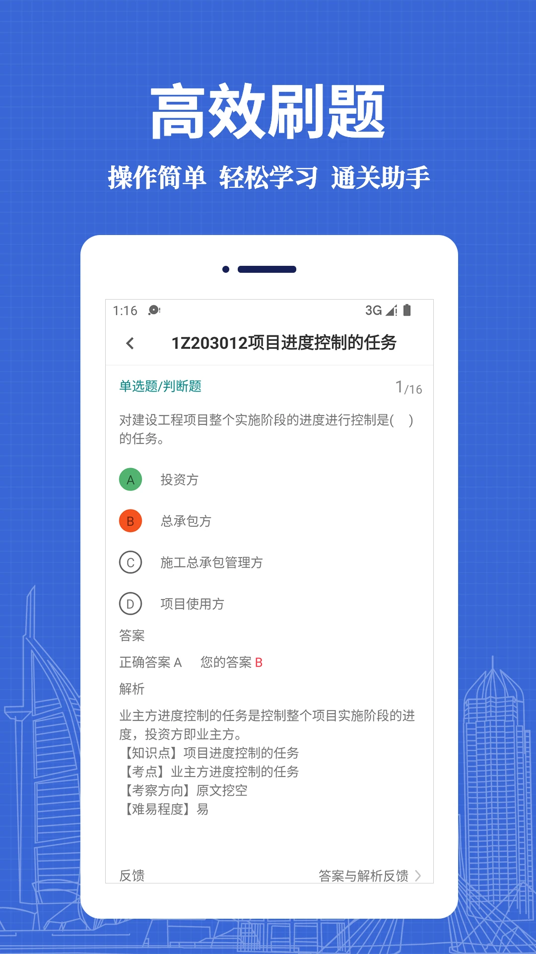 一级建造师考试题库是一建考试好帮手,新考试大纲,包含:《项目管理》、《工程经济》、《建筑工程》、《民航与机场》、《市政工程》、《水利工程》、《公路工程》、《矿业工程》、《港口与航道》、《铁路工程》、《工程法规》、《机电工程》、《通信与广电》等科目,一级建造师考试题库覆盖了考试大纲内全部考点,本题库包含章节练习、押题密卷、历年真题、模拟试题、高频题库等,专注一建学员高效备考,顺利通关。功能介绍