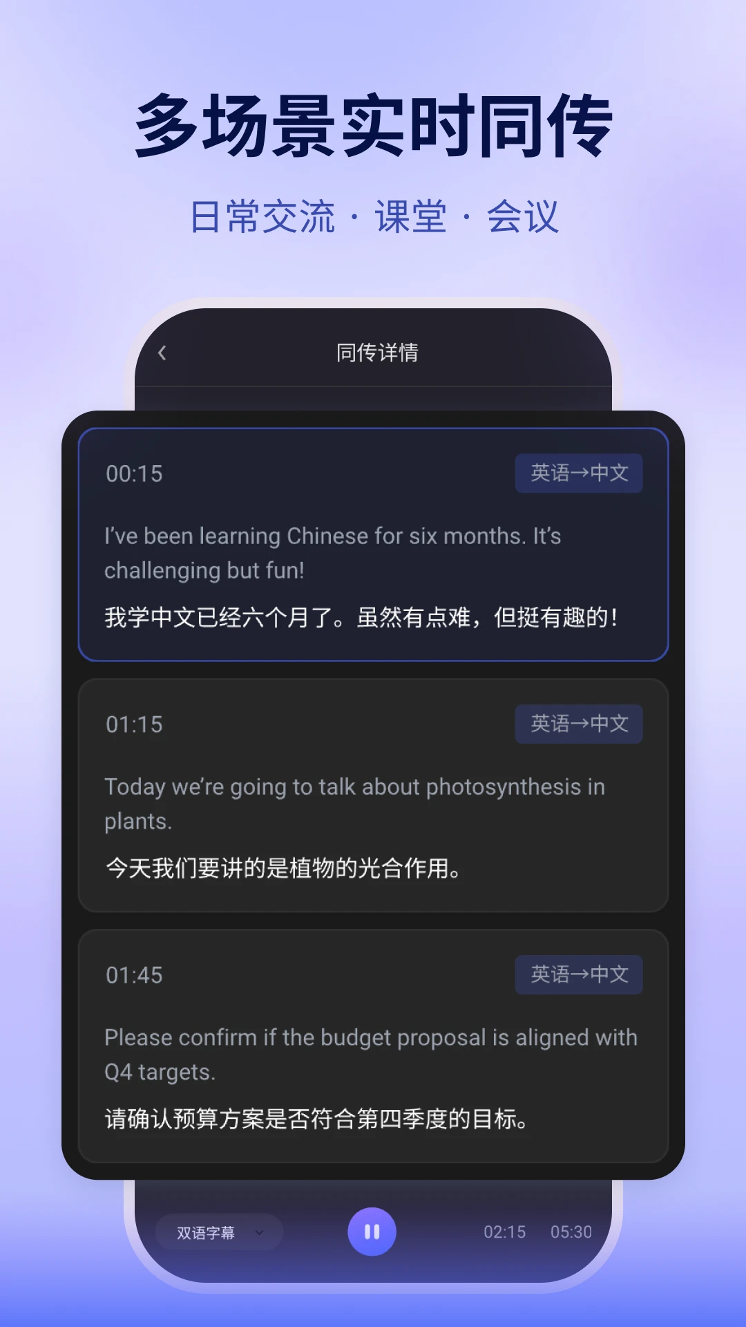 -支持「日常交流/课堂/会议」等日常场景,语音→字幕→译文全流程实时呈现。