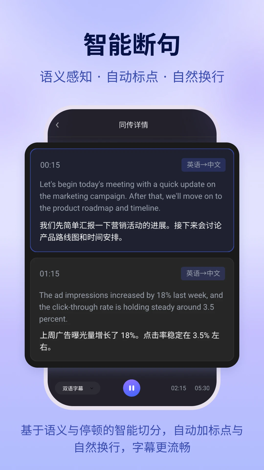 智能断句技术,优化长句处理,提升翻译流畅度和可读性。