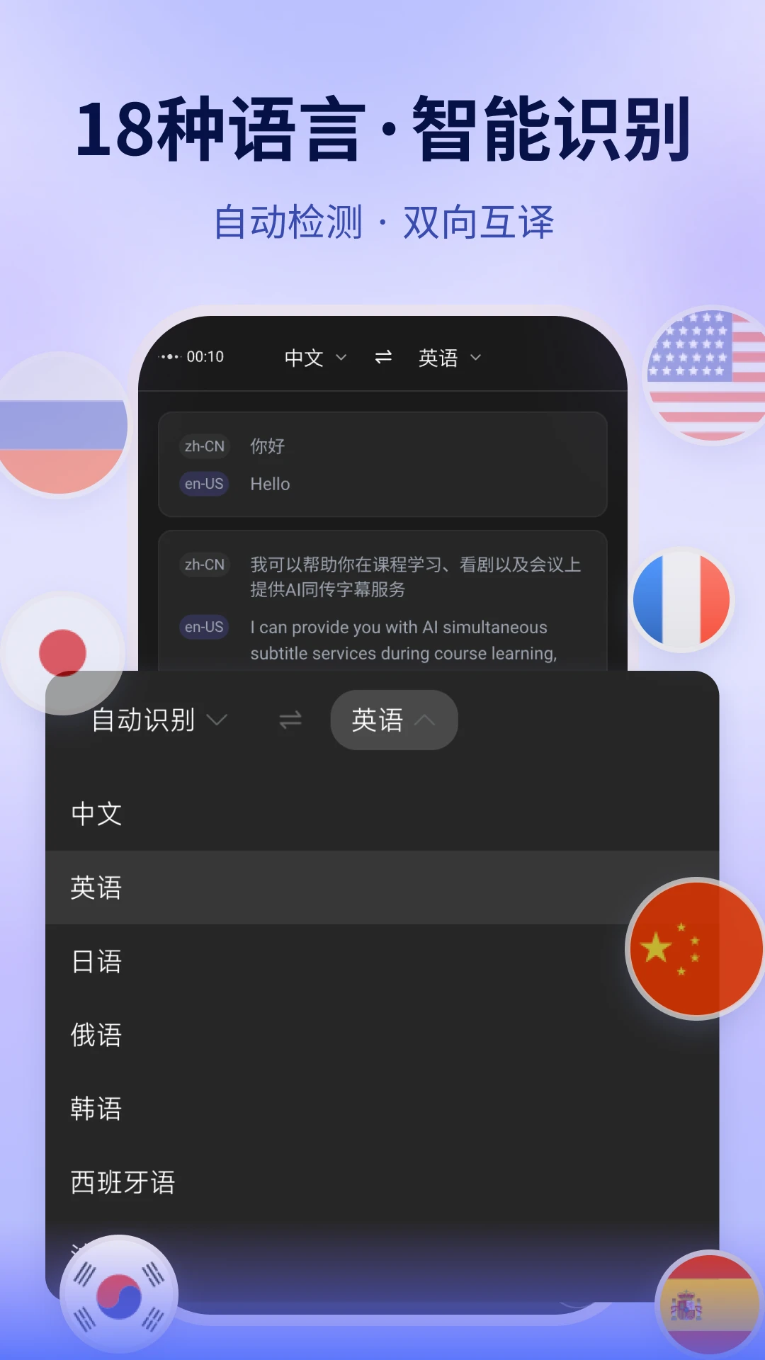 支持18种语言实时互译,覆盖全球主流语种,满足多样化交流需求。