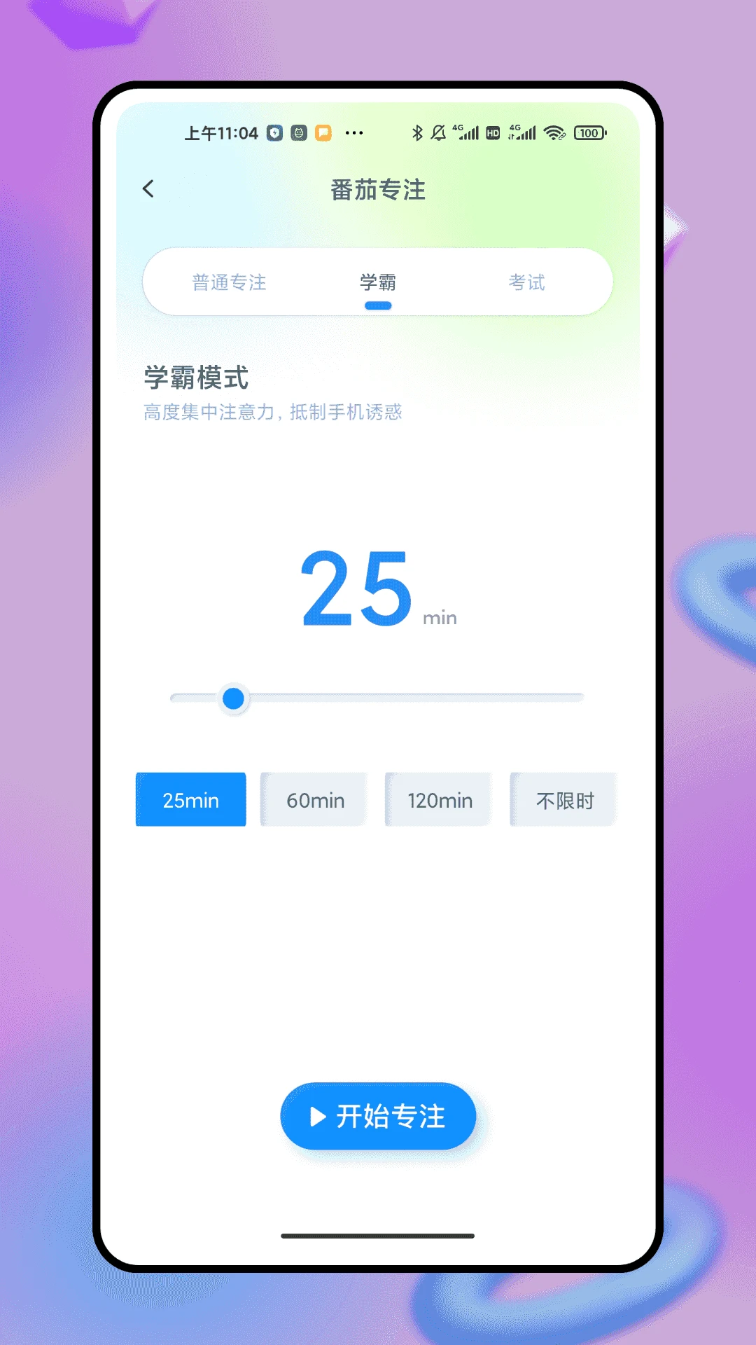 智能番茄钟提供多种专注时长选择,从25分钟到不限时,满足不同场景需求。