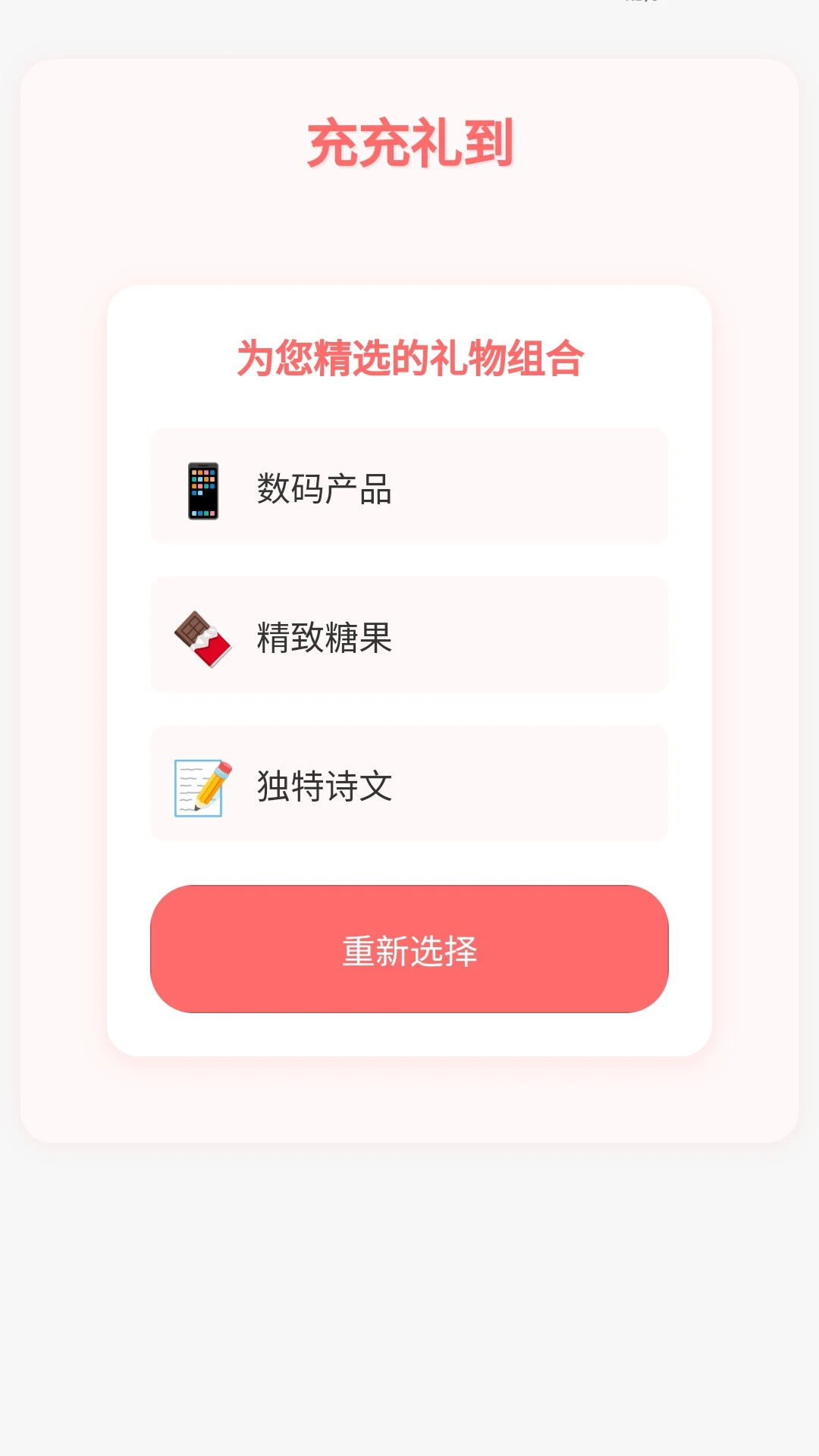 充充礼到是一个温馨有趣的礼物选择助手,它能帮你在特殊时刻挑选合适的礼物组合。通过直观的礼物类型选择,从浪漫表白到日常问候,系统会为你精心搭配实用、甜蜜和创意礼物的完美组合,让送礼变得轻松愉快。同时还有幸运充充,根据升职加薪、运动、旅行等事件,增加不同的幸运值,让您的生活充满开心与快乐。