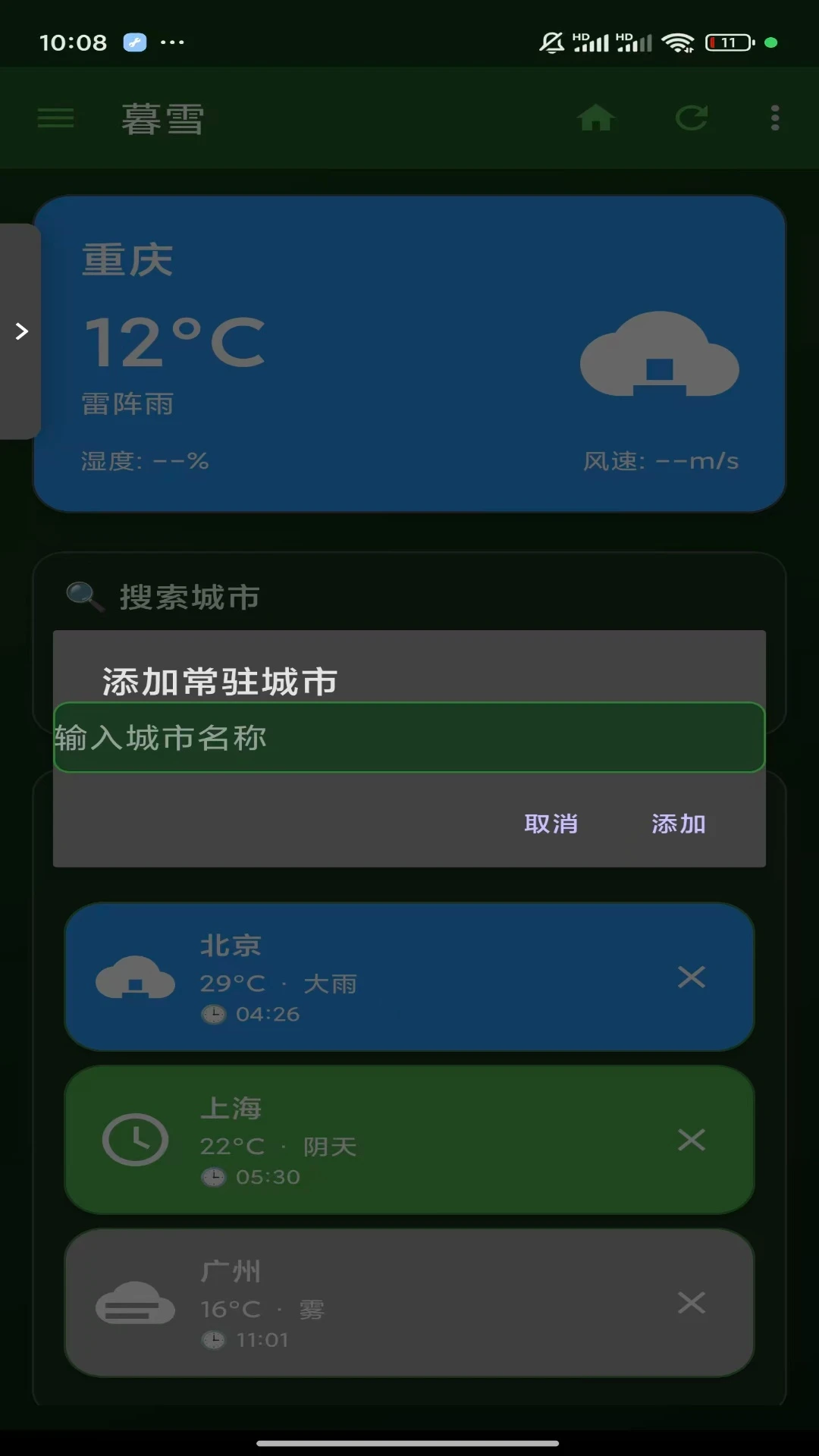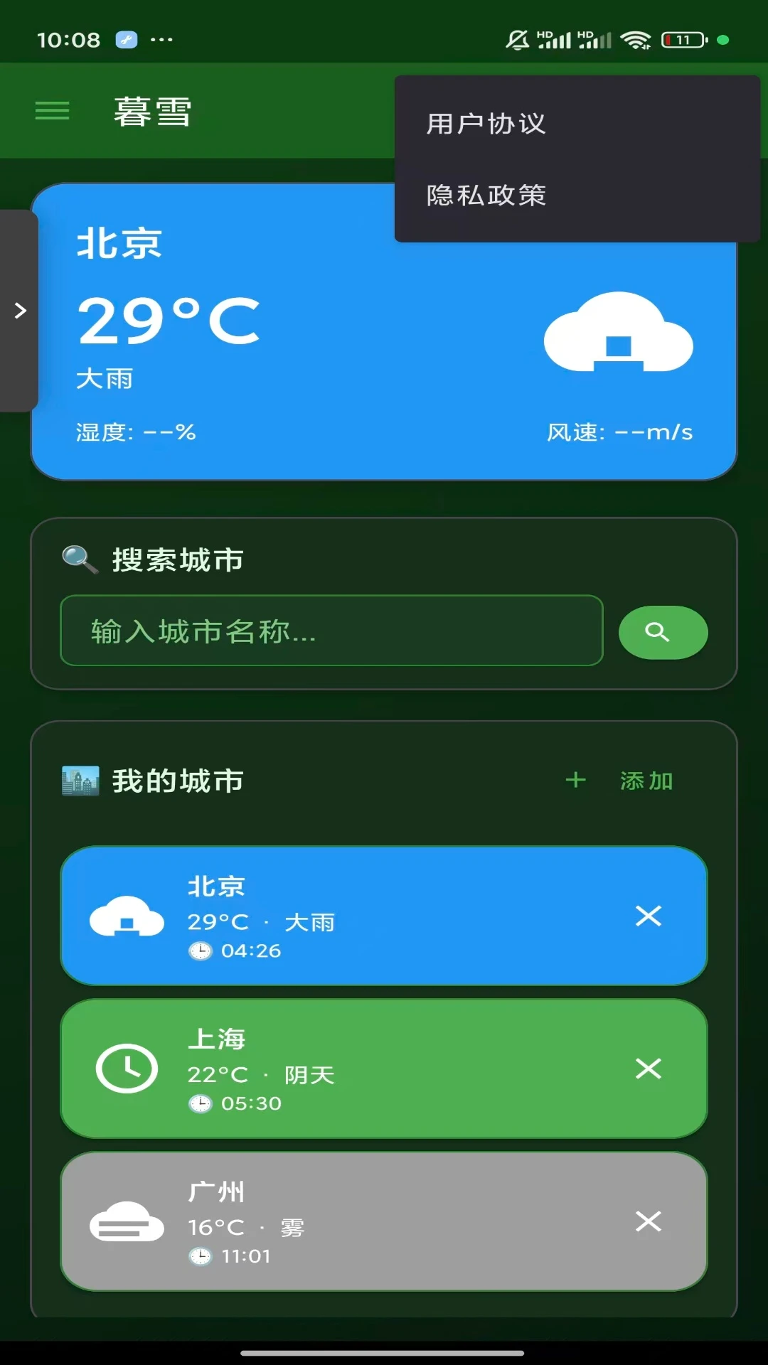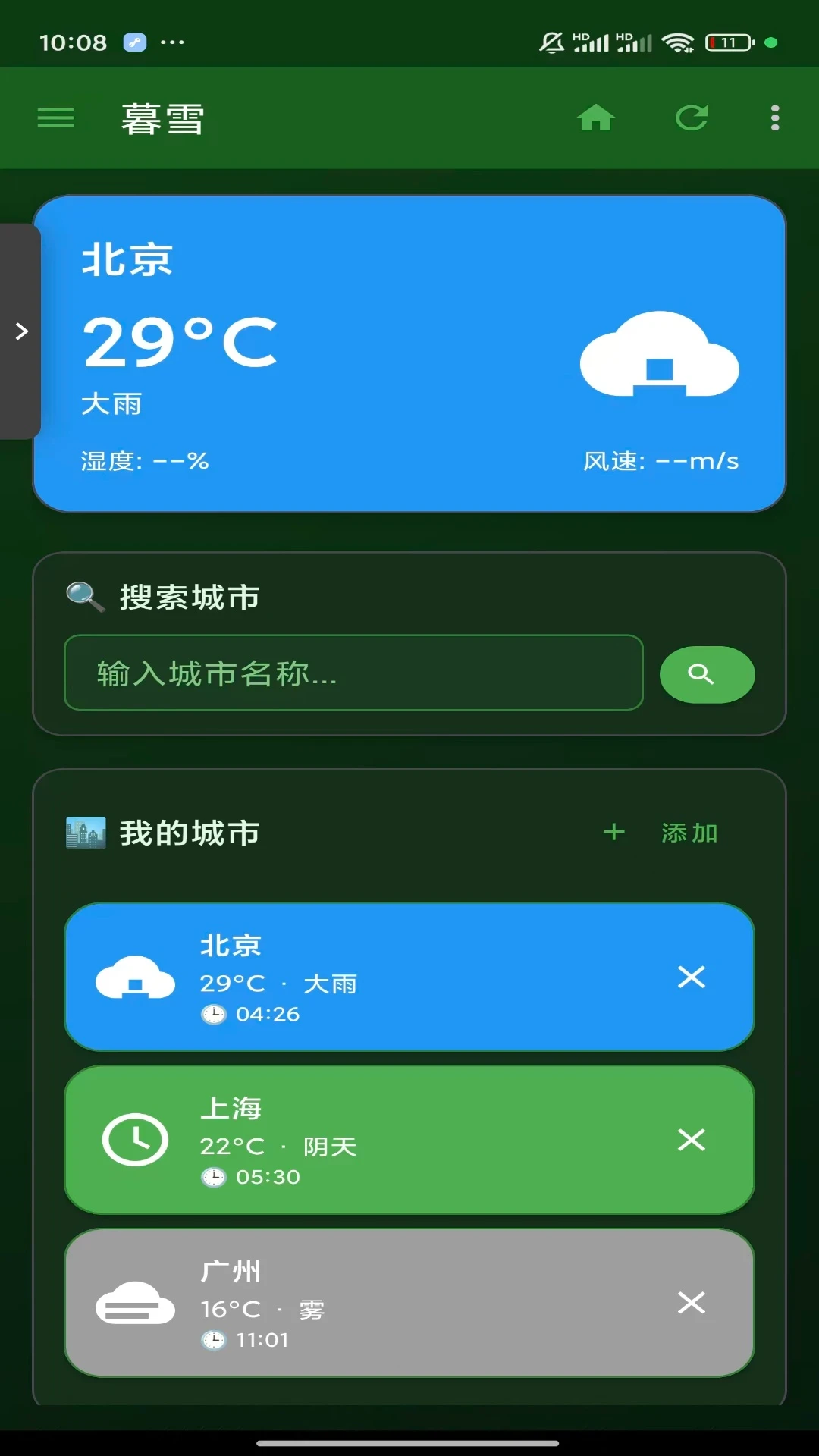 暮雪天气以优雅深绿为主题,为您提供精准天气服务。实时预报、多城市管理、精美界面,让天气查询成为享受。简洁易用,守护您的每一天出行。