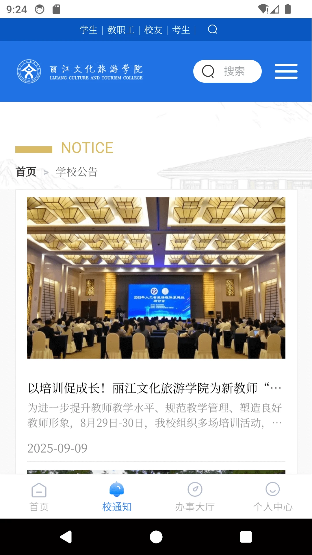 通知公告板块,同步学院官网全量资讯,确保信息及时性。