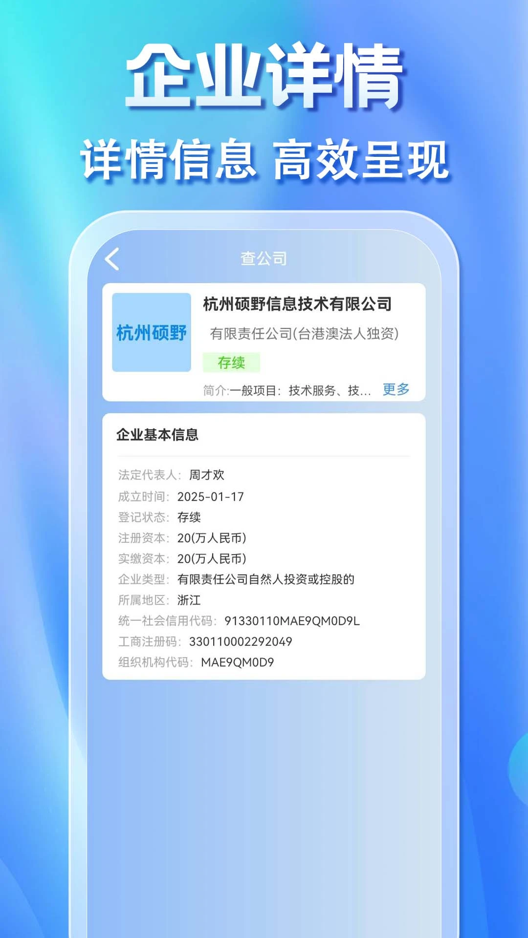 数据权威可靠:对接官方企业信用信息公示系统,确保所有数据真实、准确、及时更新。操作简单直观:采用极简设计理念,即使是初次使用的用户也能快速上手操作。