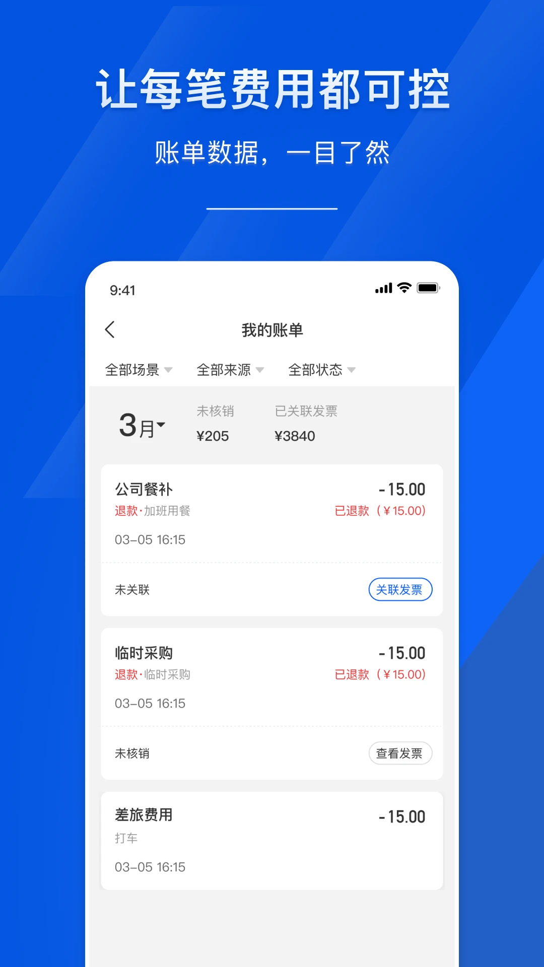 麦芽智励·费用版,依托支付宝企业支付通道,集成组织架构、发票、单据流程、费用管控等能力,为企业员工因公消费提供报销工具。