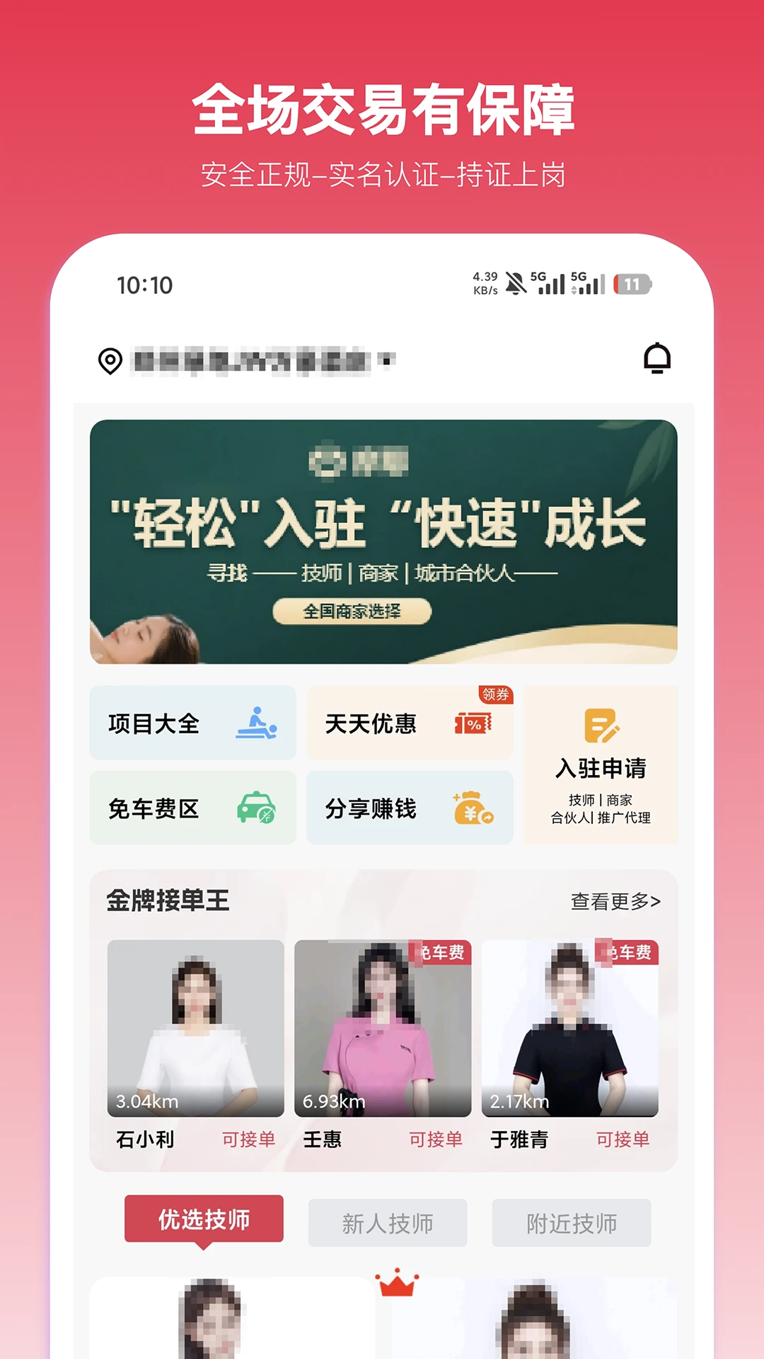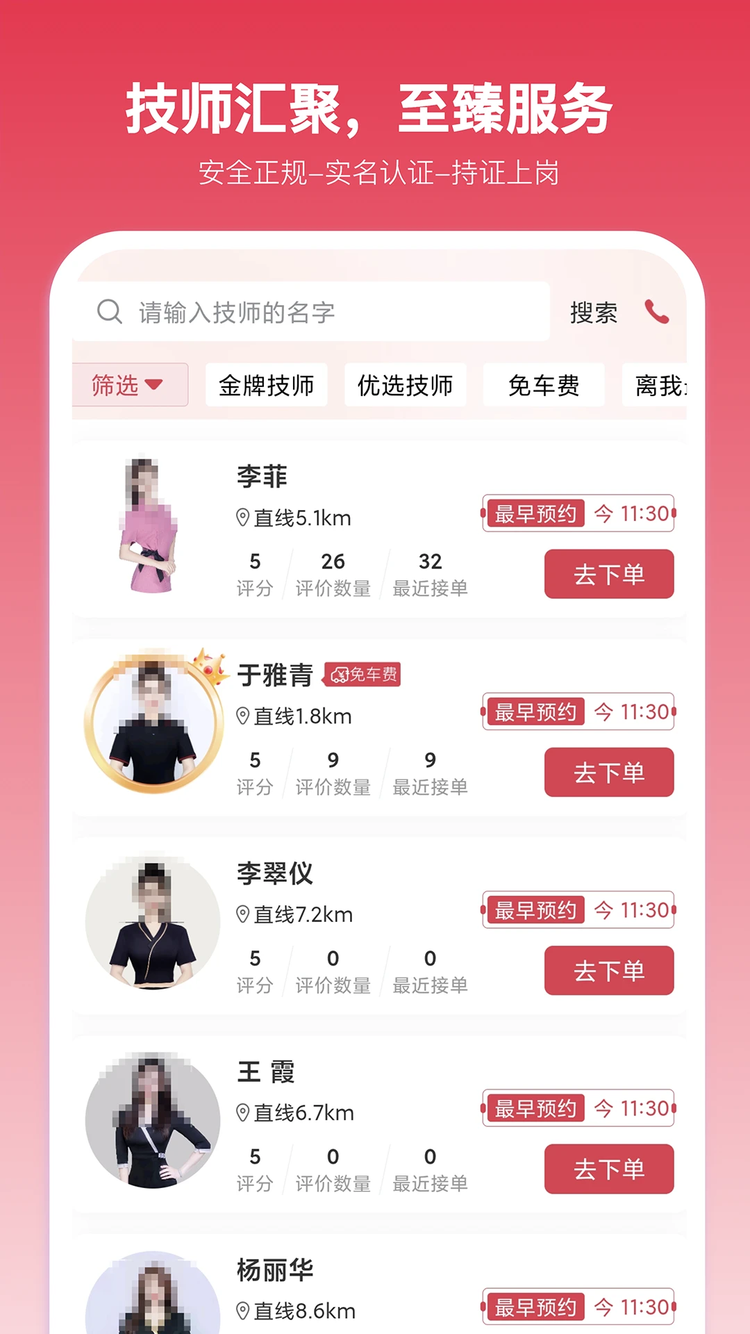 智能匹配系统:通过算法智能推荐附近技师,用户可查看技师资质、评价等信息。