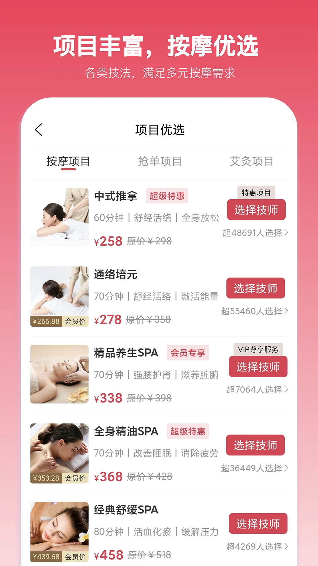 上门按摩服务:摩耶按摩提供专业技师上门服务,用户无需出门即可享受高品质按摩体验。多种按摩项目:涵盖中医推拿、精油SPA、健康足疗等多种服务,满足不同用户需求。
