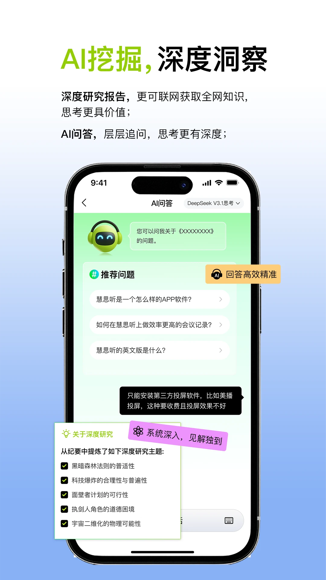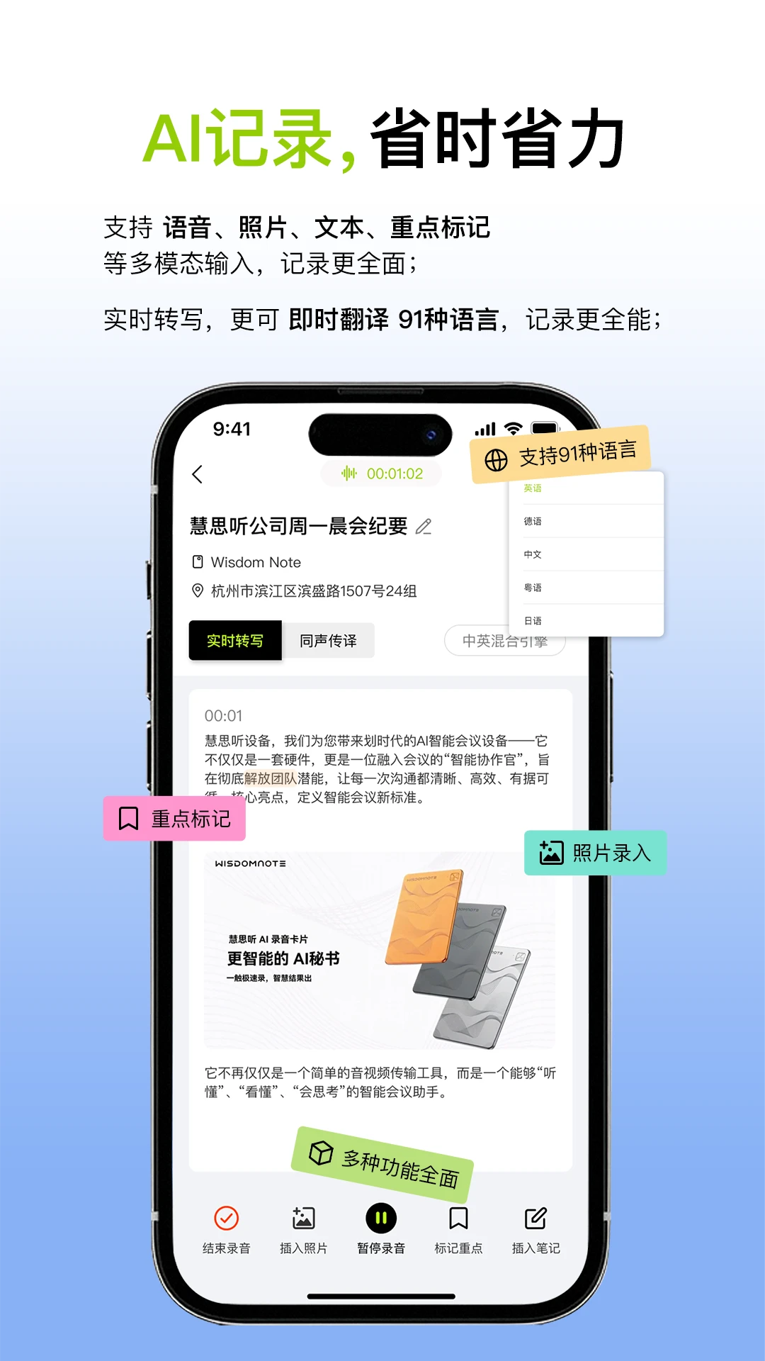 相比传统录音笔,慧思听提供完整的语音到文字的解决方案,节省大量整理时间。AI处理速度快,即使是长时间的会议录音,也能在几分钟内完成转写和总结。