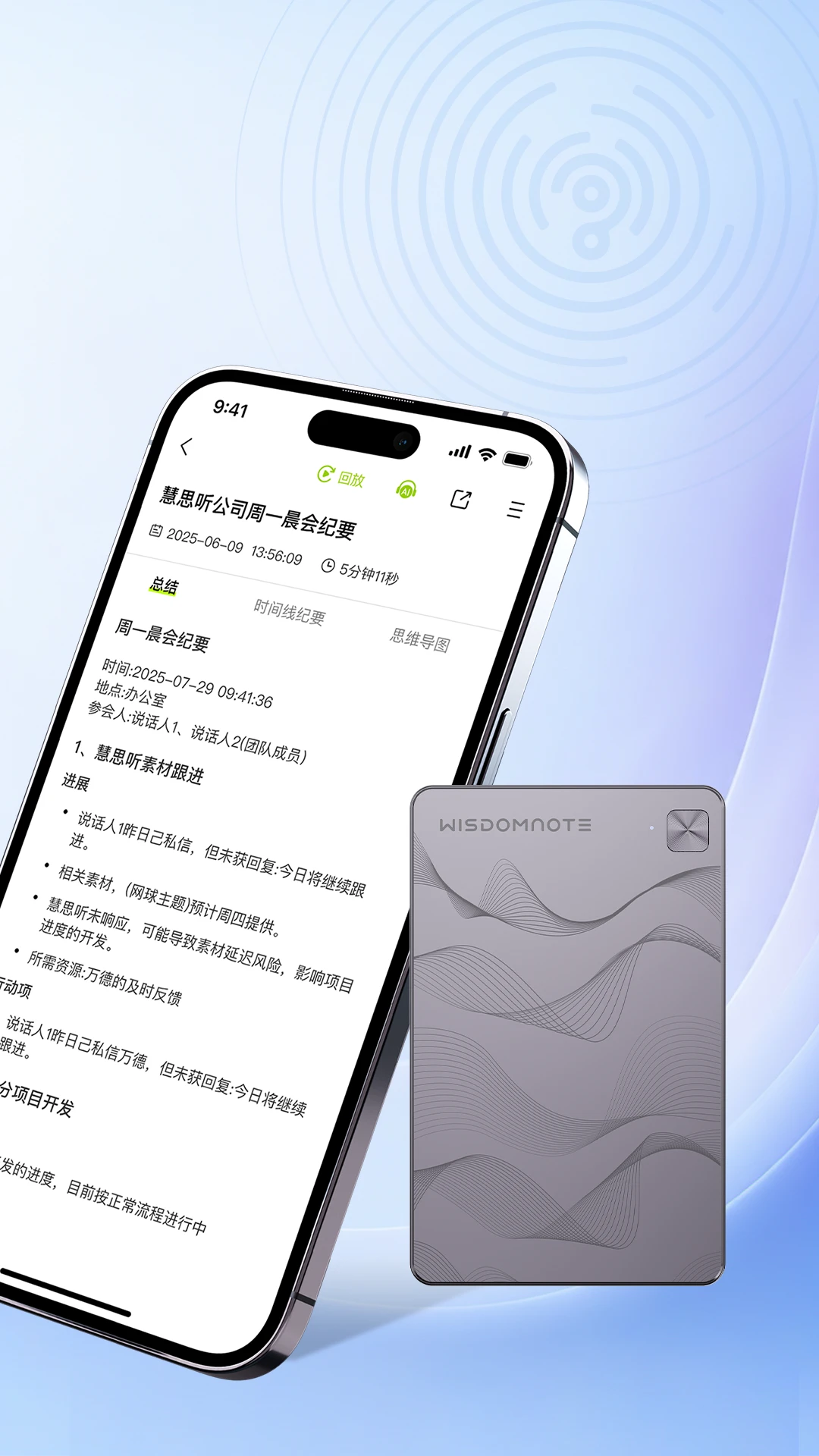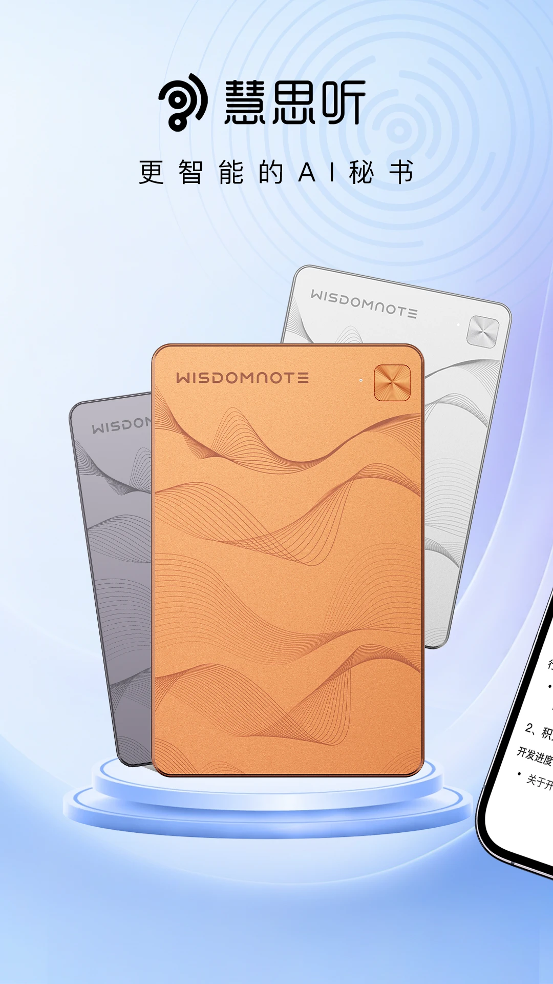 慧思听APP搭配超薄精致的AI录音卡片,深度融合前沿AI大模型,打造一站式智能语音记录解决方案。从通话、会议到课堂、采访,慧思听让每一次记录都更方便、更清晰、更智能。