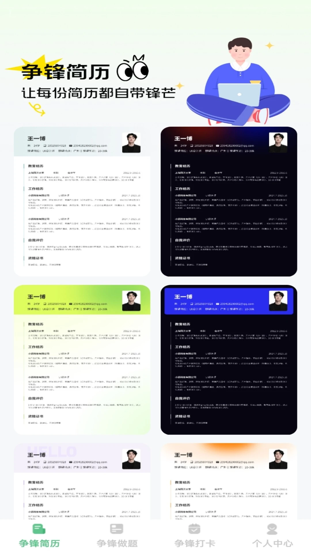 "步步争锋"是一款助力求职与学习的应用。它提供多样简历模板,方便用户打造个性化简历;涵盖银行招聘、烟草局招聘等多类考试题库,支持刷题、背题,还有错题本、收藏夹辅助学习;同时具备打卡功能,帮助用户规划待办事项,养成良好学习与求职准备习惯。
