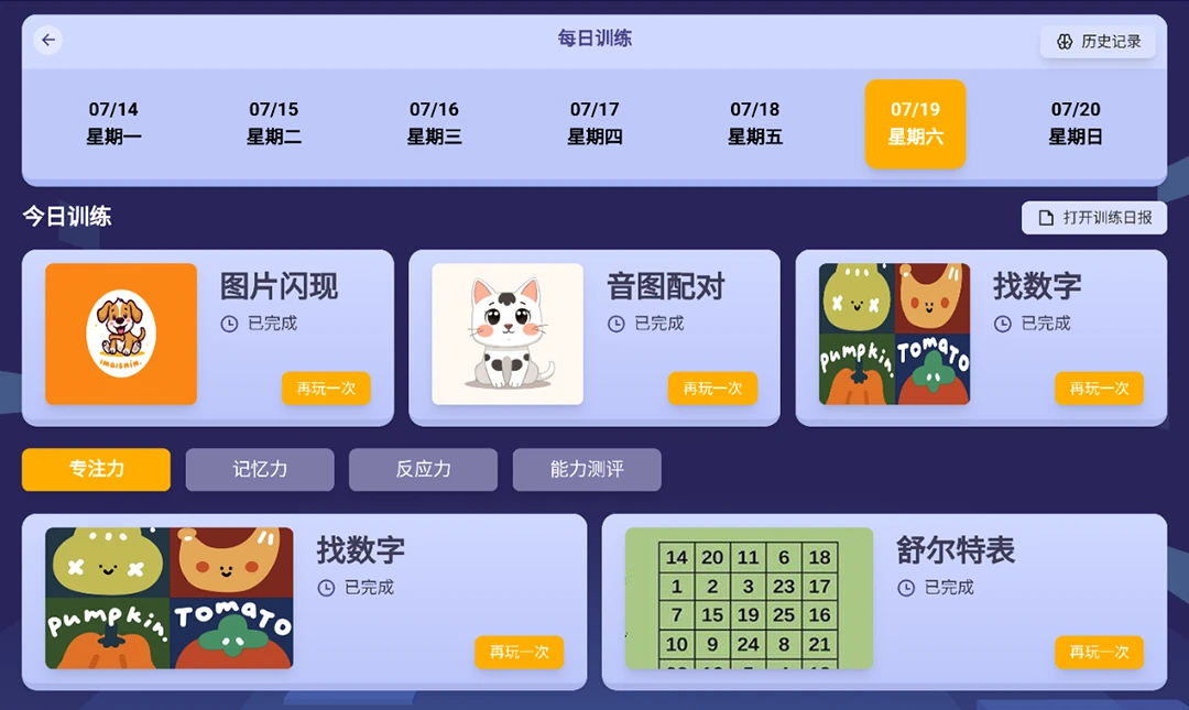 成长档案功能自动同步检测数据,形成长期跟踪报告,便于家长掌握孩子的专注力发展轨迹。