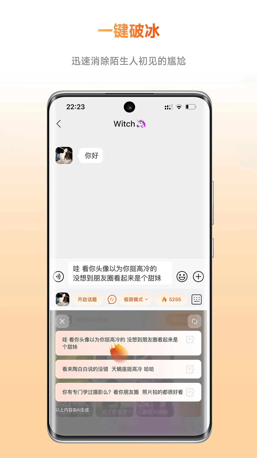 破冰功能针对不同社交阶段提供定制化开场白,消除初次接触的尴尬氛围