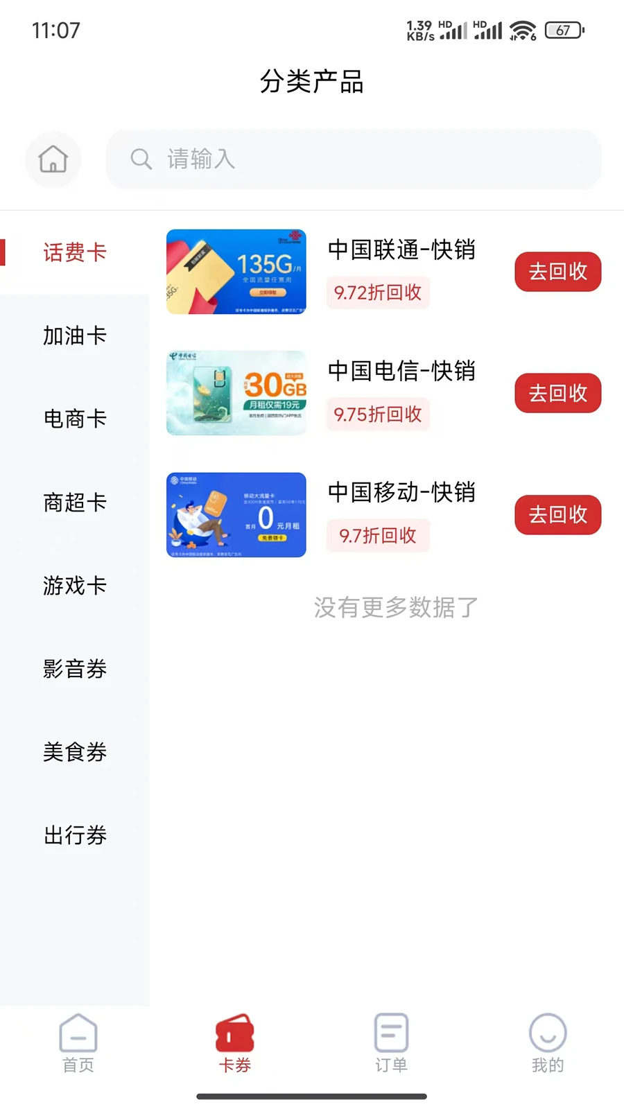 支持京东e卡回收,覆盖多种面值,满足不同用户需求。 提供话费卡回收服务,包括移动、联通、电信等主流运营商卡券。 支持加油卡回收,涵盖中石化、中石油等常见品牌。 购物卡回收范围广,包括大润发、百联等知名商超卡券。 提供礼品卡回收服务,帮助用户快速变现闲置卡券。 支持“回收购物车”功能,批量处理多张卡券,提升效率。