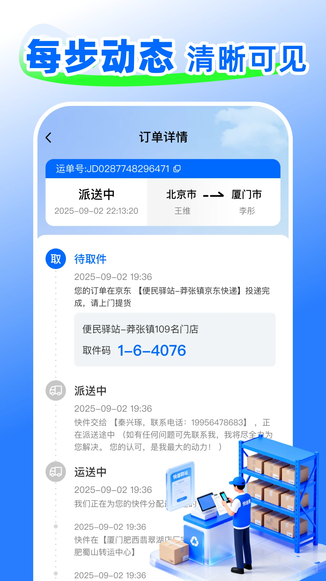 快递查询:支持输入运单号或扫码,实时追踪物流轨迹,掌握包裹动态,物流信息更新推送及时;