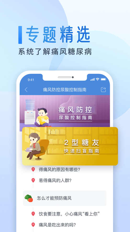 提供海量糖尿病相关知识,包括新手专题、专家视频讲座等,让控糖降尿酸变得简单易懂;