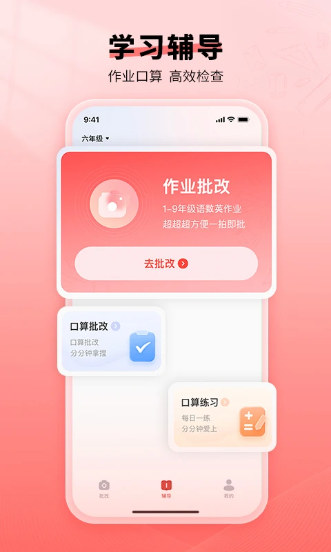 智能拍照批改:支持1-9年级全学科作业批改,家长只需用手机拍照即可完成检查,覆盖数学口算、语文填空、英语选择等多种题型。