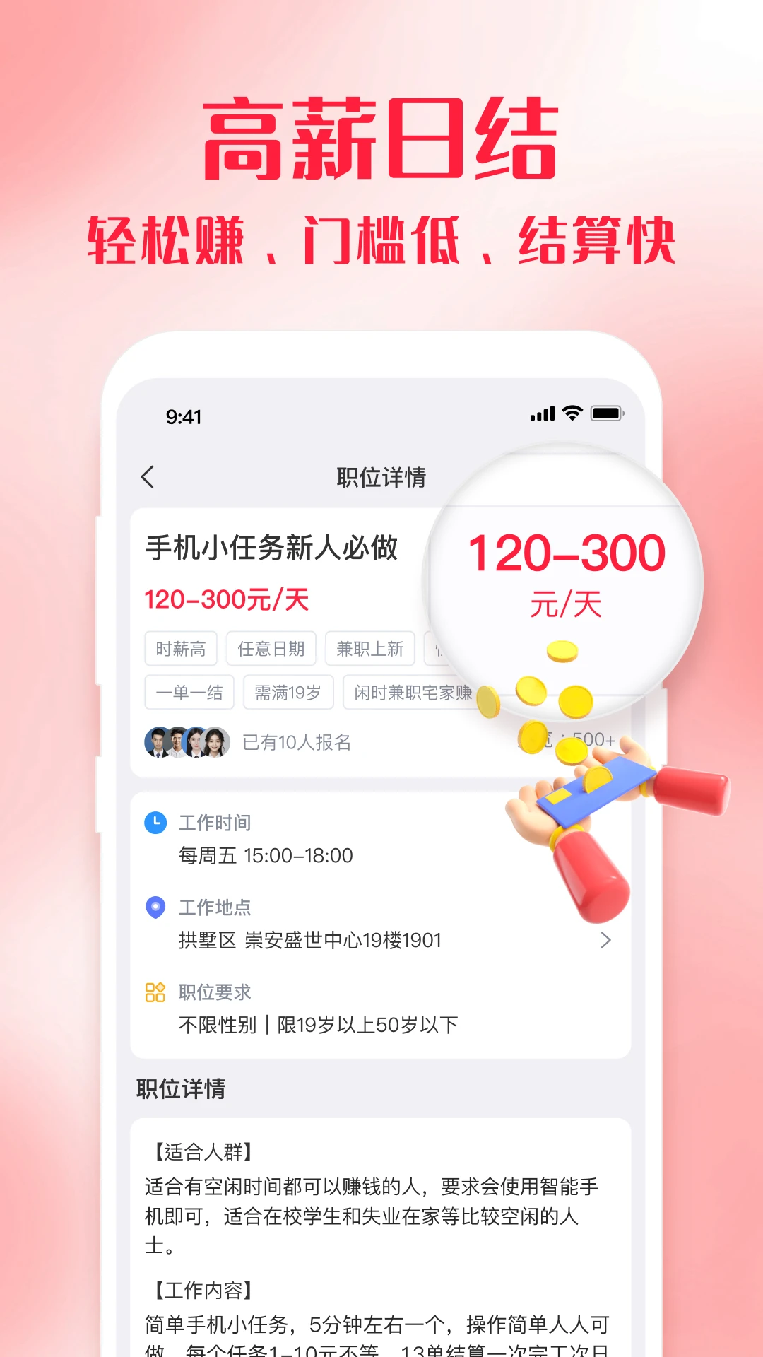 严格的商家审核机制确保岗位真实性,降低用户被骗风险。