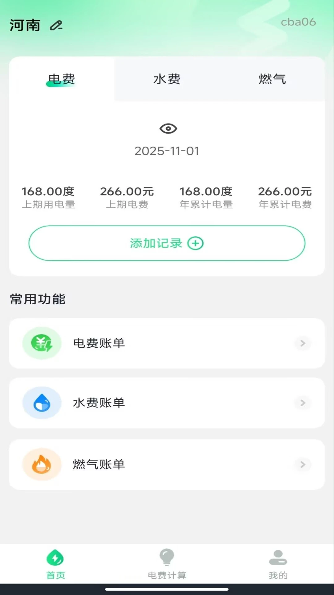 费用记录与周期汇总:支持用户自主录入电、水、燃气缴费信息,系统自动按月度、年度进行费用与用量的统计分析,生成清晰的周期报告。