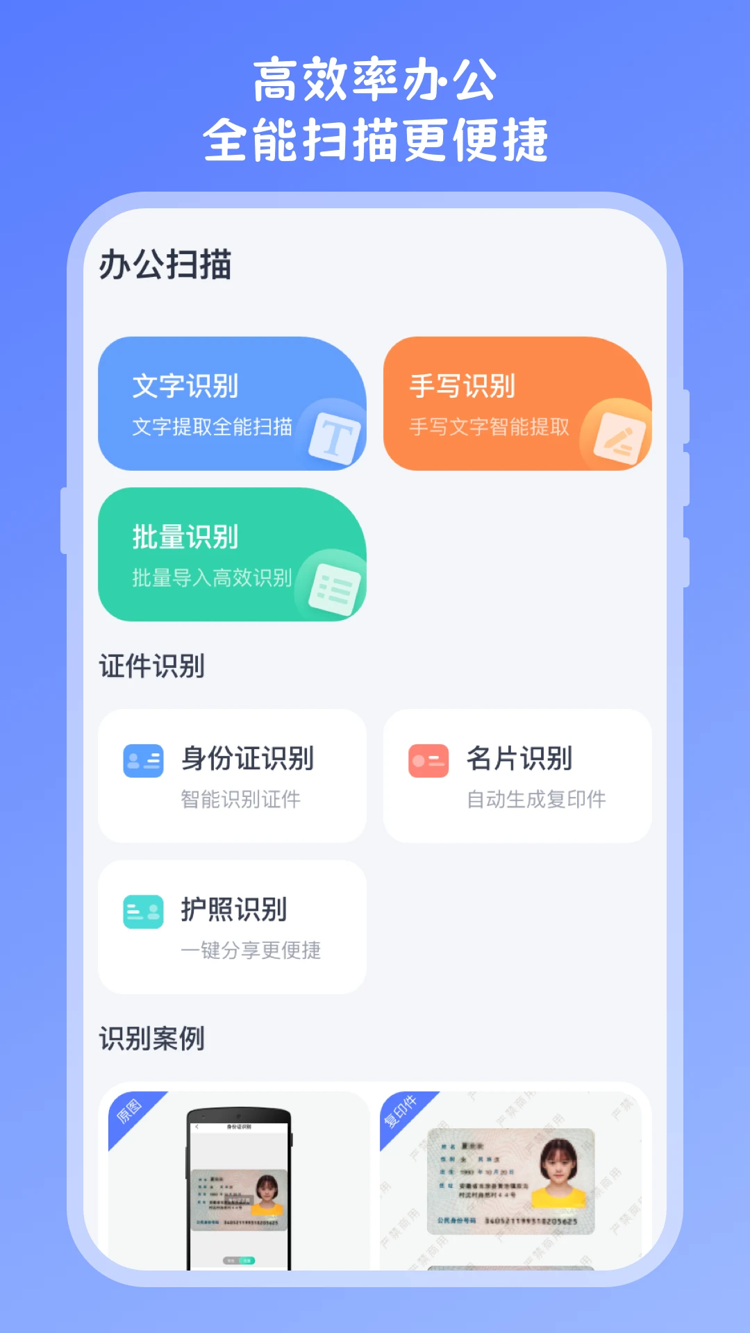 办公扫描功能涵盖文字识别、手写识别和证件识别,满足多样化需求。